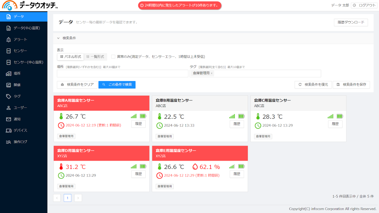 温度センサーと湿度センサーをグループ分けする「タグ機能」を新たに追加しました。複数のセンサーを1つのタグにまとめることで、一括での検索や設定変更が可能になり、大規模施設での運用を大幅に効率化できます。