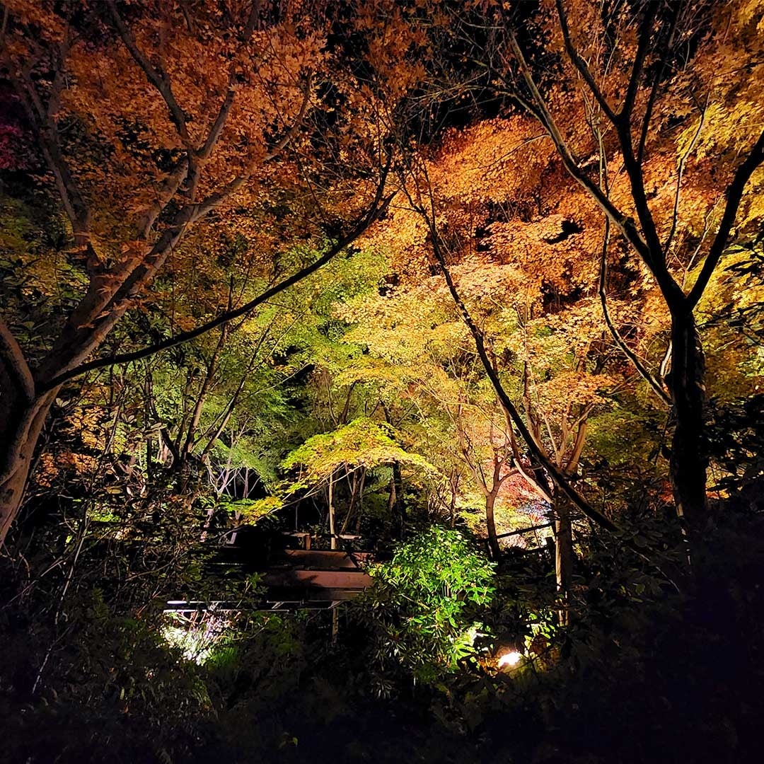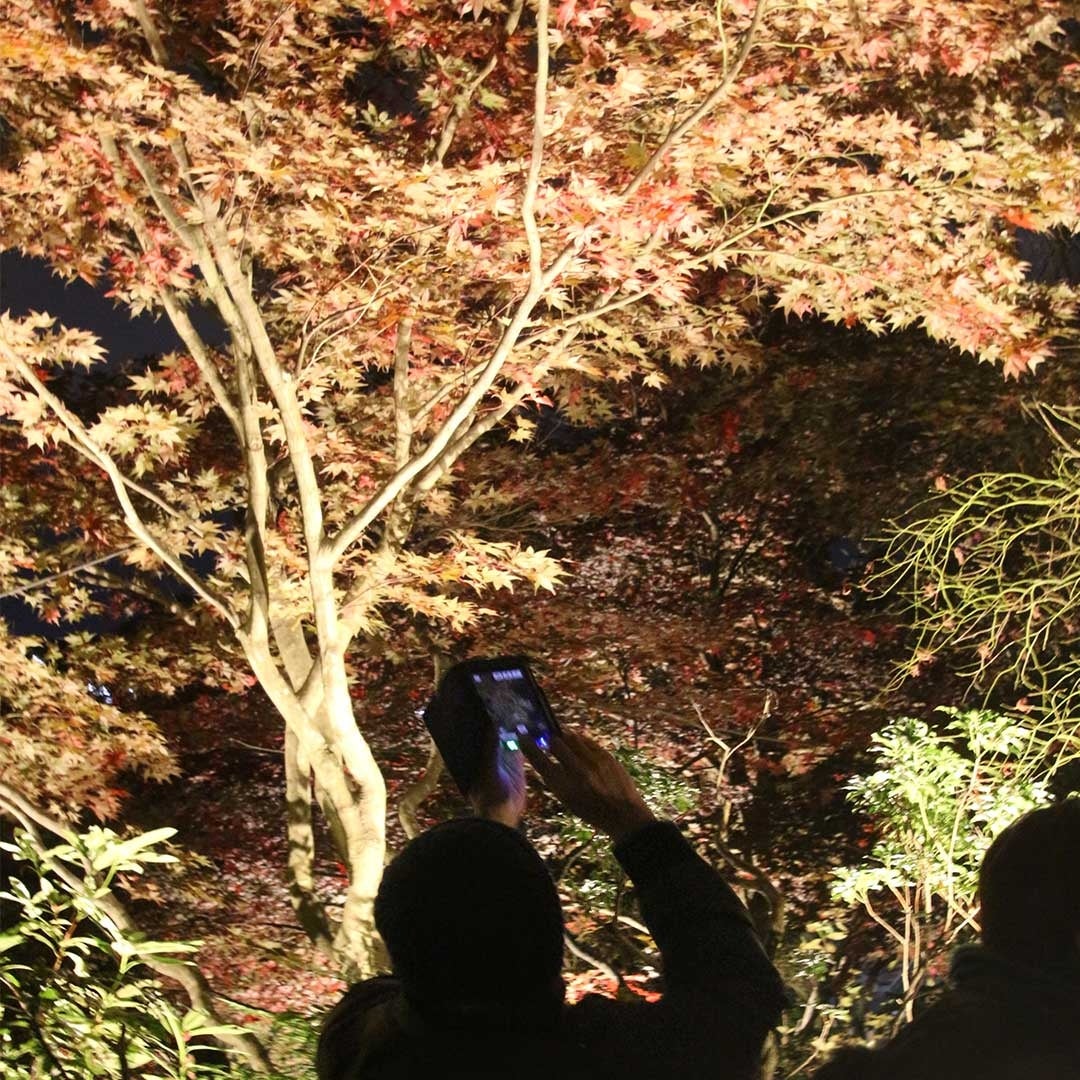 約500個の竹灯籠をもみじ谷までの道中に設置し、足元を照らします。この竹灯籠のうち、約300個は花の文化園で活動するボランティア団体「フルルガーデン倶楽部」の方々と、千早赤坂村にて竹コンシェルジュとして竹を活用した活動を行っている「bamboo池田屋」の代表、池田 亮氏の指導のもと、竹林の伐採から始め、竹を専用機材で切って、穴をあけて作成しました。全て手作りによるものです。