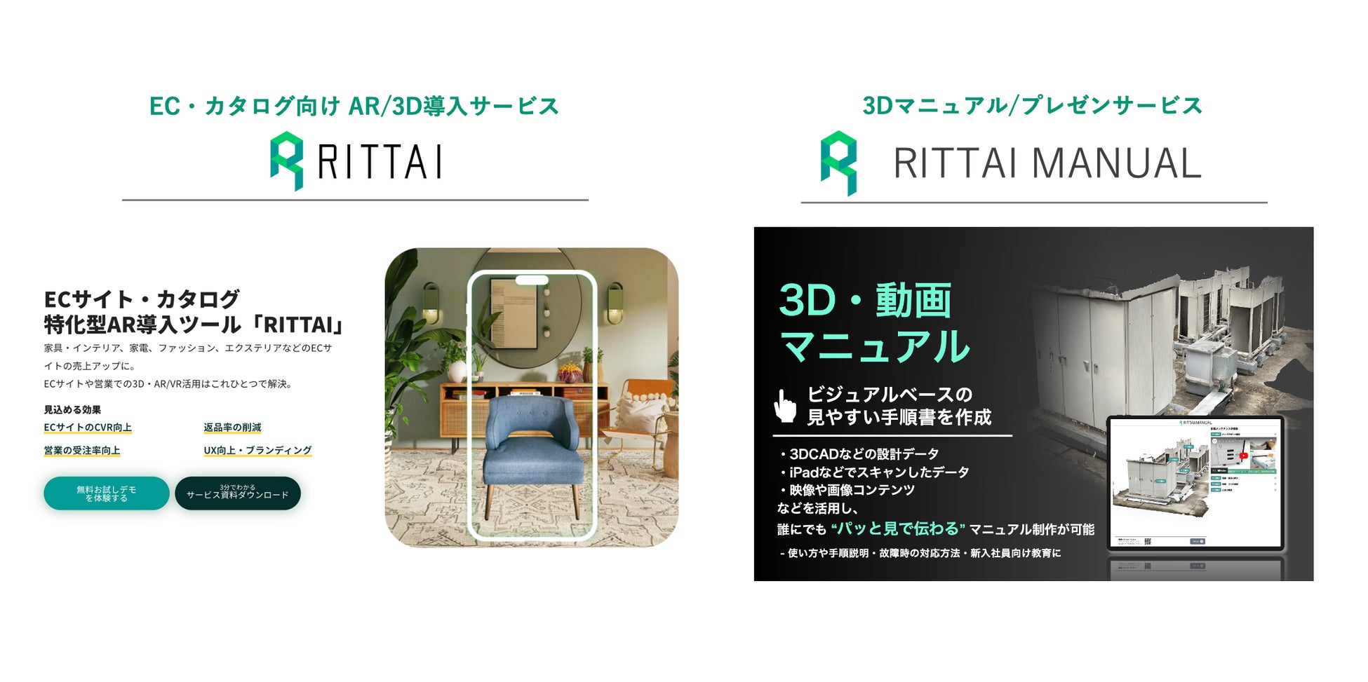 オンラインショップやカタログに手軽に「AR試しおき機能」や、「商品3Dビュワー機能」などを導入できるサービス「RITTAI」