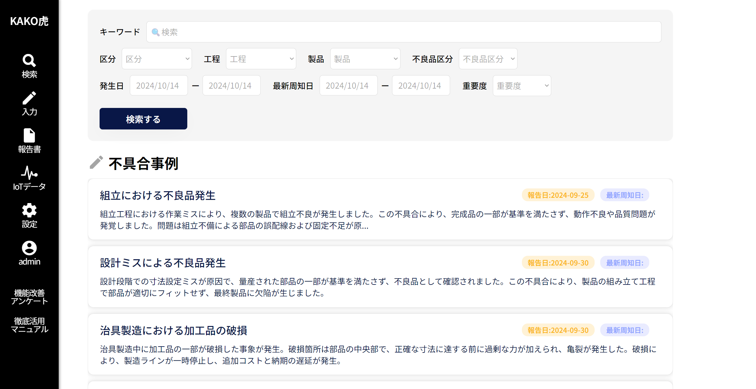 高度な検索システムにより、まさに確認したい過去の不具合事例・ノウハウを瞬時に見つけることができます。検索に用いる情報は報告書・ノウハウ資料のタイトルだけでなく、製品名・不具合の発覚工程・資料内の文章まで対象に含まれており、精度の高い検索機能を提供しています。