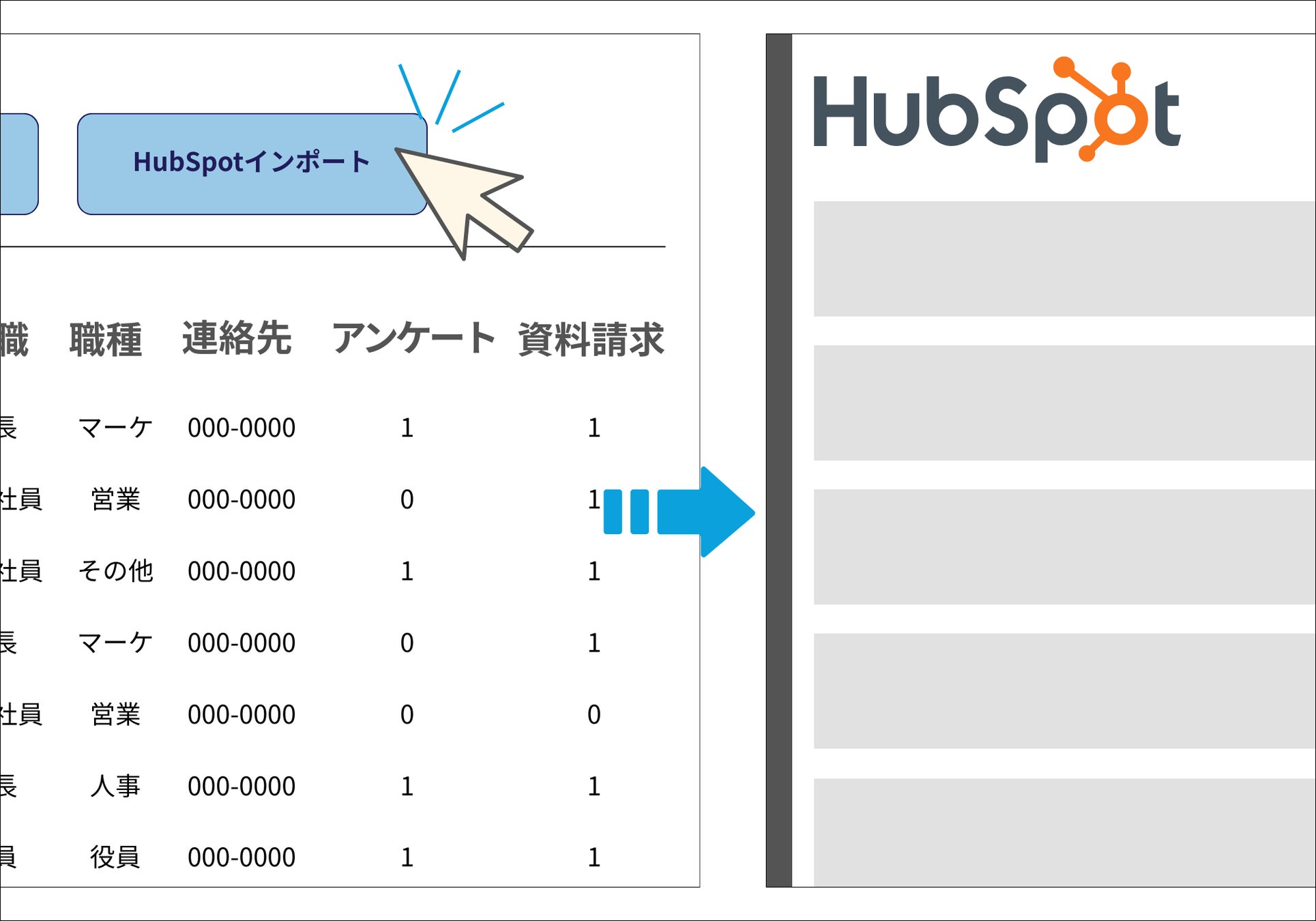 「Hubspotインポート」ボタンを押すだけで、整形済みデータをリアルタイムでHubspotに反映。