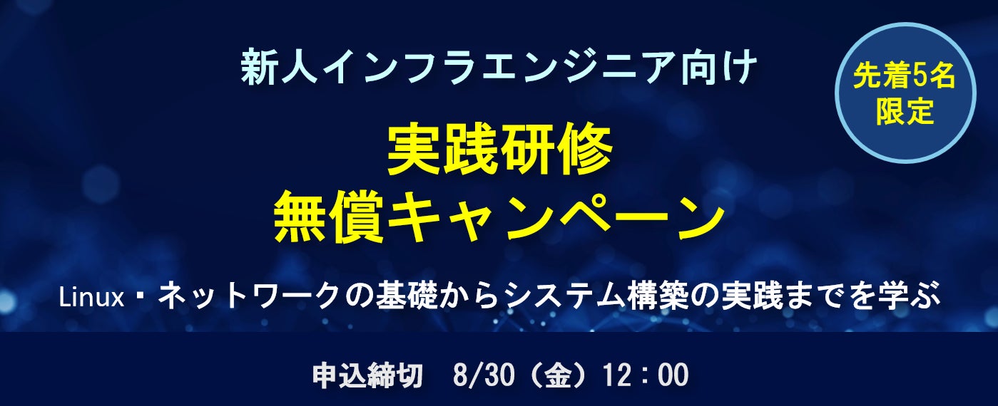 19日間でLinux・ネットワークの基礎からシステム構築の実践までを学ぶ「新人インフラエンジニア向け実践研修」、先着5名限定の無償提供キャンペーンを開始