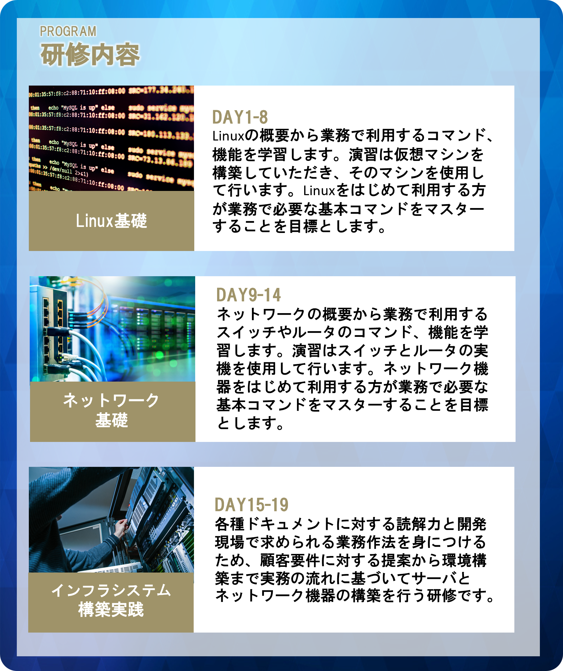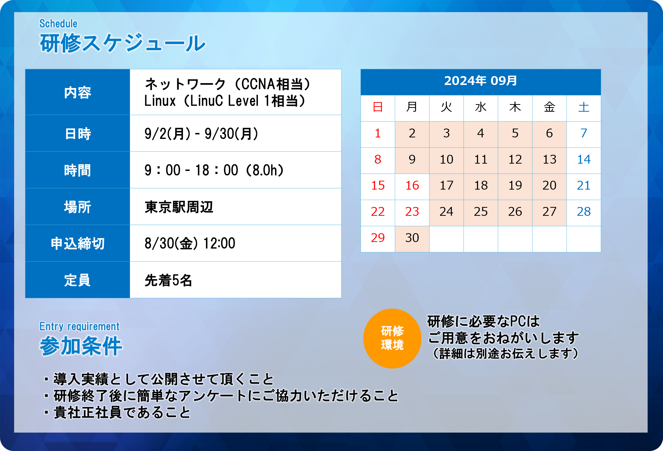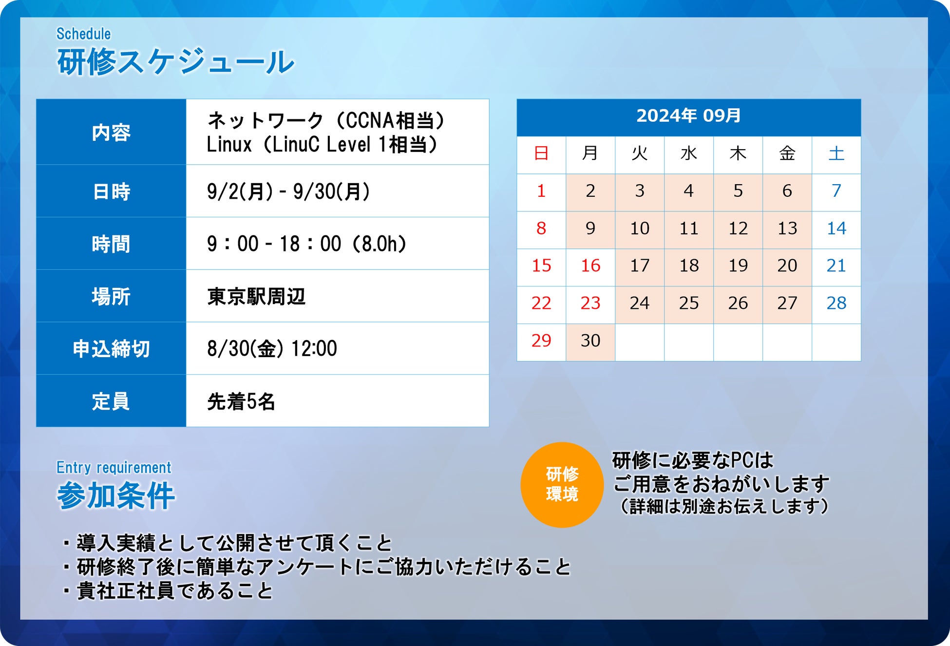 ~インフラエンジニアの育成にお悩みの教育担当の方に。研修は9/2(月)~9/30(月)の平日19日間、東京駅周辺で実施。お申込み受付は8月30日(金)まで~