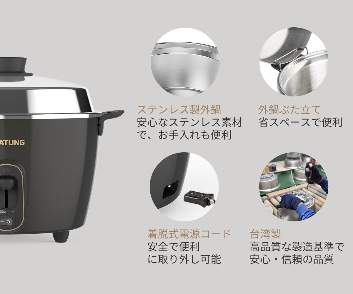 安心して長くお使いいただくために、電鍋の内部素材には、食品グレードのSUS304ステンレスを採用しています。錆びにくく、耐久性に優れているため、お手入れも簡単です。毎日使うものだからこそ、安全性と清潔さにも徹底的にこだわりました。
