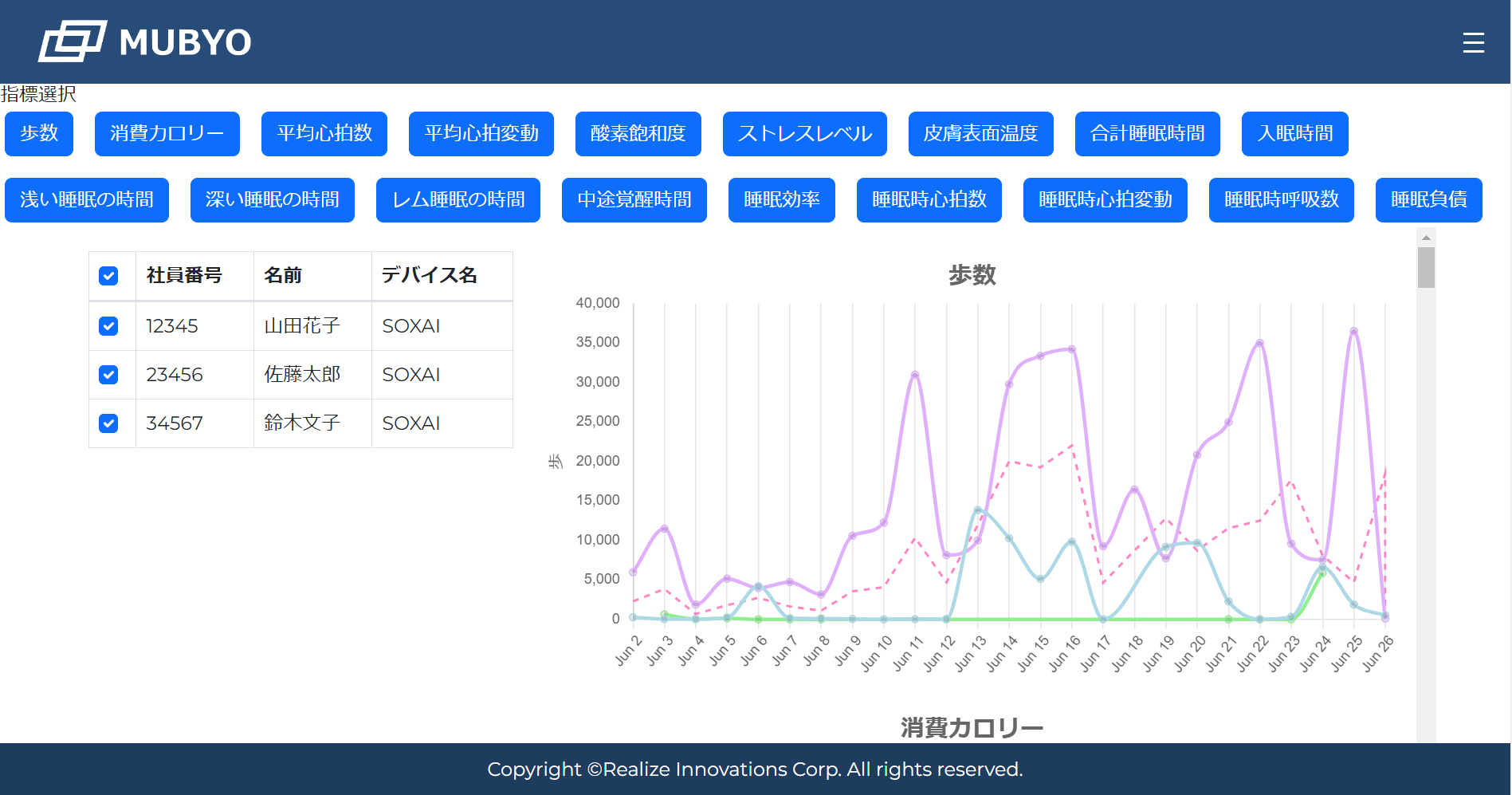 多様なデバイス対応:スマートリングなどの ウェアラブルデバイスとの連携もしくはスマートフォンアプリのみのいずれでも対応可能です。初期対応デバイスとしてスマートリング「SOXAI」(https://soxai.co.jp/)とアプリによる睡眠計測ソリューション「Asleep」(https://realize-innovations.jp/press/20231106/)をサポートします。これにより従業員は日常生活で負担なく使用できるため、企業側も継続的なデータ確認と適切なサポートが実現可能になります。