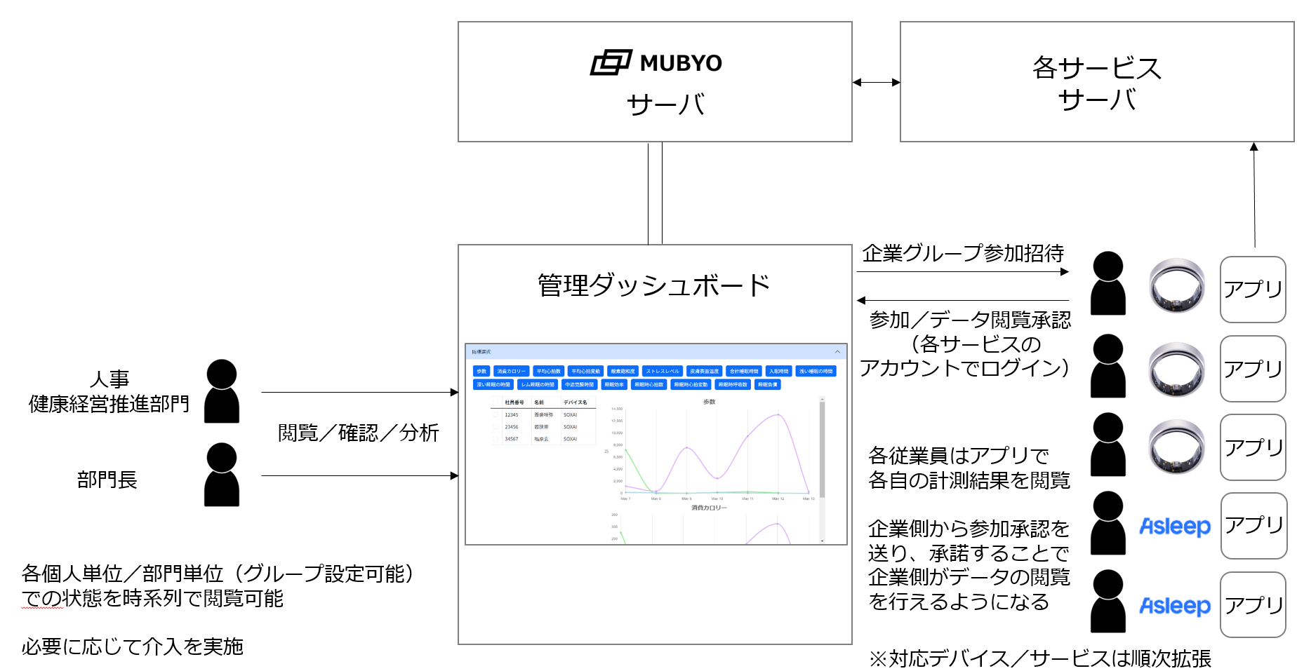 本システムは、スマートリングやその他のウェアラブルデバイスおよびスマートフォンを通じて取得した睡眠やバイタルデータその他の健康データを一元化し、従業員の健康管理を効率化します。歩数、心拍数、心拍変動、皮膚表面温度、睡眠時間、睡眠段階などのデータを高精度に計測・管理し、健康状態を詳細に可視化するとともに、多角的な分析が可能です。これまで各種のヘルスケアサービスは利用者が自ら計測結果を確認することしかできませんでしたが、本システムは従業員に対して企業アカウントへの参加を依頼し、ログインすることで各ヘルスケアサービスのデータをAPI連携にて取得し、企業が一元管理することを実現しています。