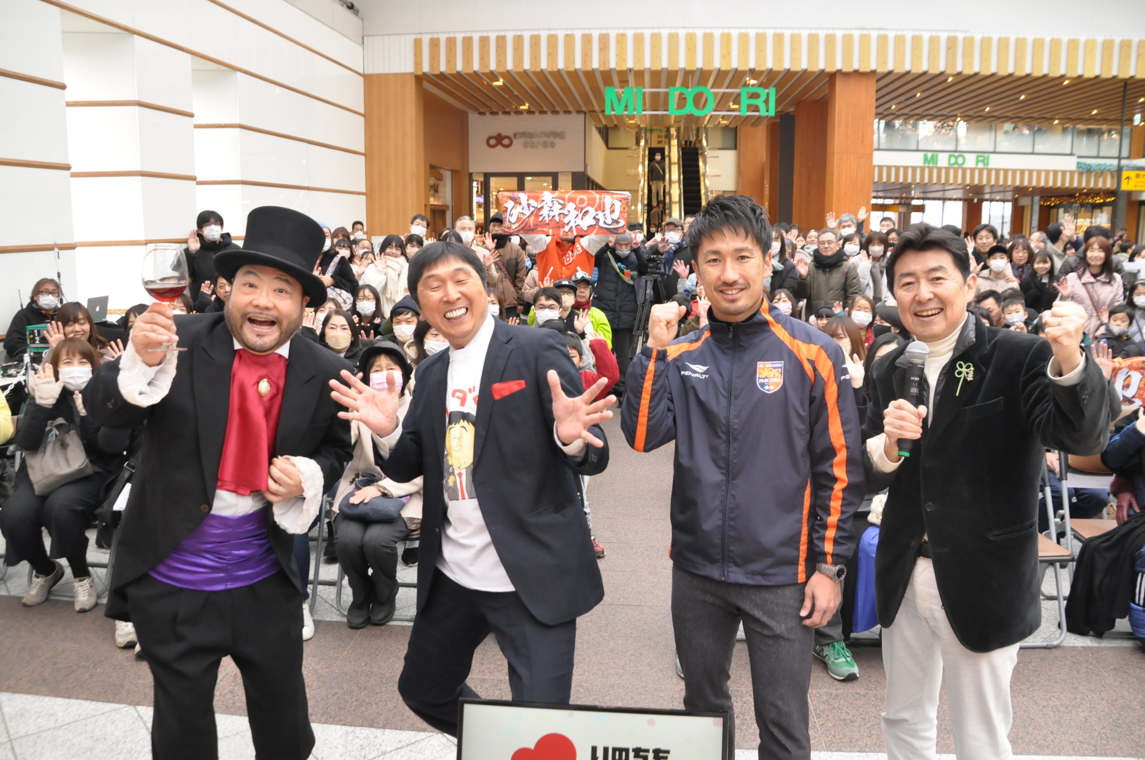 ◆ゲスト(左から)髭男爵 山田ルイ53世さん・ほいけんたさん・砂森和也さん(AC長野パルセイロ)