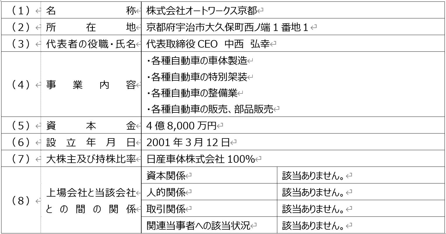 会社名:株式会社オートワークス京都代表者:代表取締役社長CEO 中西 弘幸本社所在地:京都府宇治市大久保町西ノ端1番地1設立:2001年3月12日資本金:4億8,000万円事業内容:各種自動車の車両製造、各種自動車の特別架装、各種自動車の整備業、各種自動車の販売、部品販売URL:https://www.awk.co.jp/