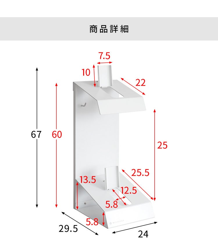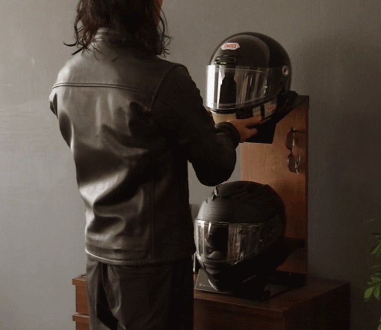 ヘルメットフック2個、バイクや車のキーが掛けられるフック2本、グローブを収納できる棚付きでお出かけの時に必要なものをまとめて収納できます。ヘルメットを上下に並べて置けるのでお出かけ時のコーディネートや気分で被りたい方をサッと取り出せます。
