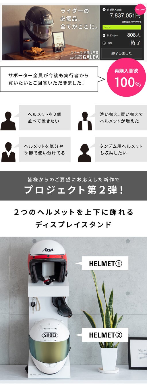 あらゆる家具の企画・製造・販売を行う家具メーカーの株式会社宮武製作所(所在地:大阪府大阪市、代表:岡本雅文)は、バイカーにとって大切なヘルメットを飾りながら収納できる『GALEAシリーズ』の新商品をMakuakeにて先行販売をいたします。新商品はバイカーの必需品を省スペースで飾れる商品になります。