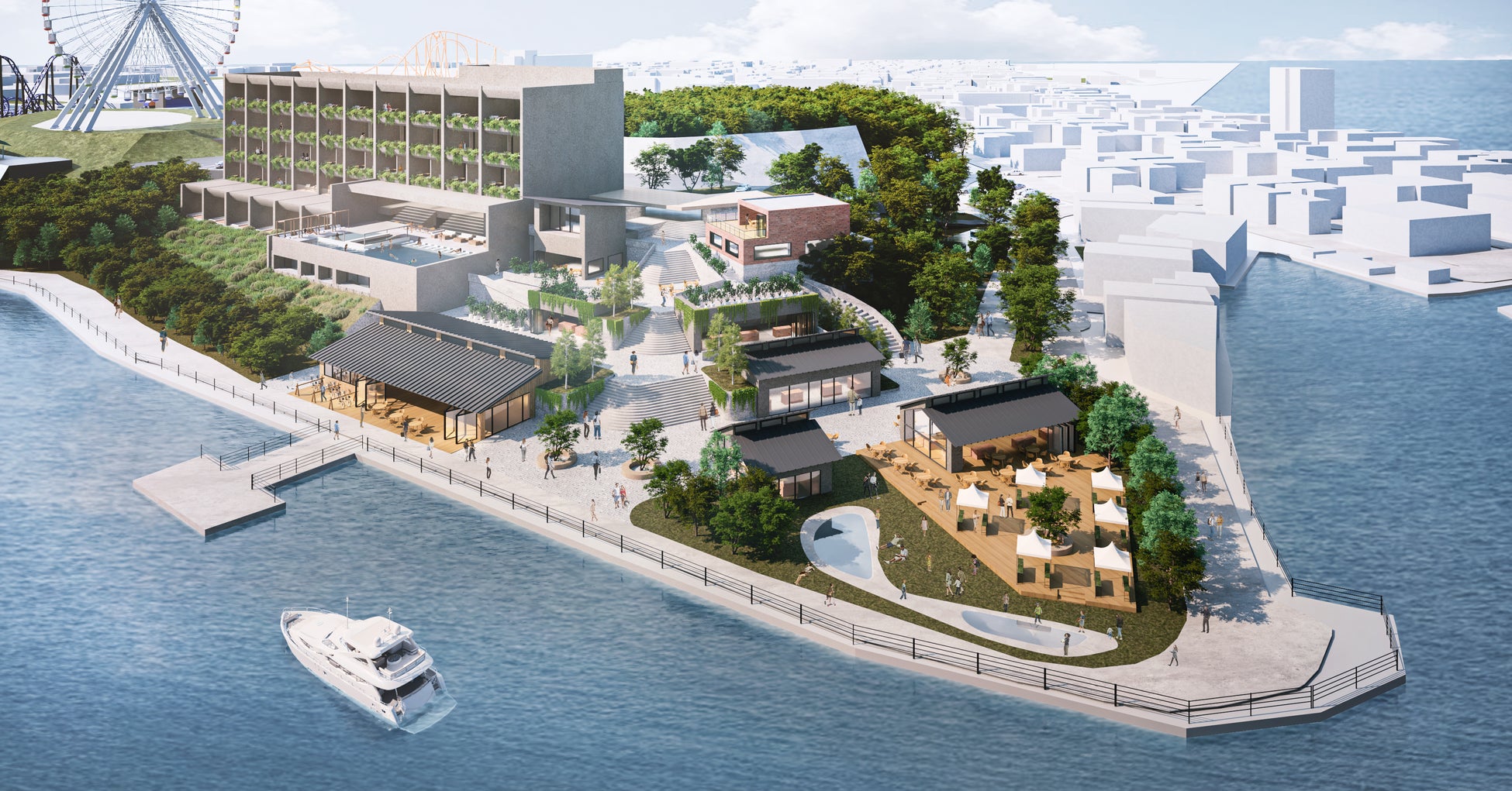 新施設は、浜名湖の豊かな観光資源を地域事業者との共創を通じて最大限に活かし、地元の特色を反映した独自のコンテンツを提供する「ホテル」、「レストラン」、「SPA」、「商業」が連動した複合施設とする計画です。また、地域の皆様や行政機関とも連携し舘山寺温泉全体の活性化も合わせて進めてまいります。