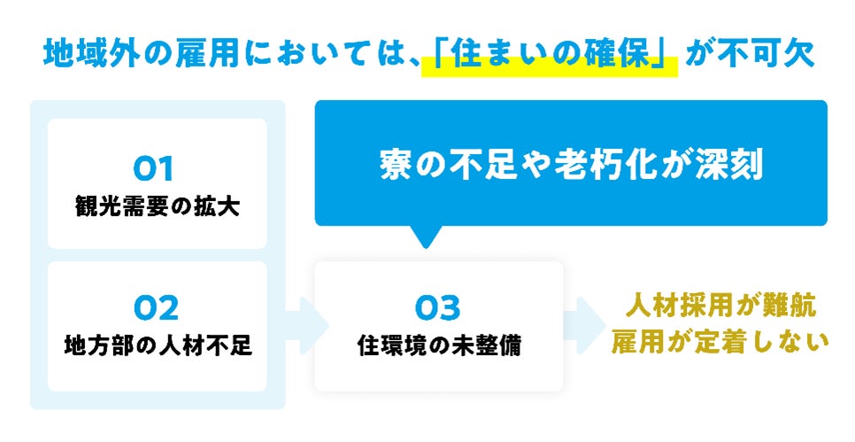 創業以来20年以上に渡り日本全国から人材を集客し、観光施設とのマッチングを通じてこの問題に真正面から向き合ってきた株式会社ダイブ。その志に共感し、「住まい」を起点とした地域活性化に取り組む新たなプロジェクトに参画します。