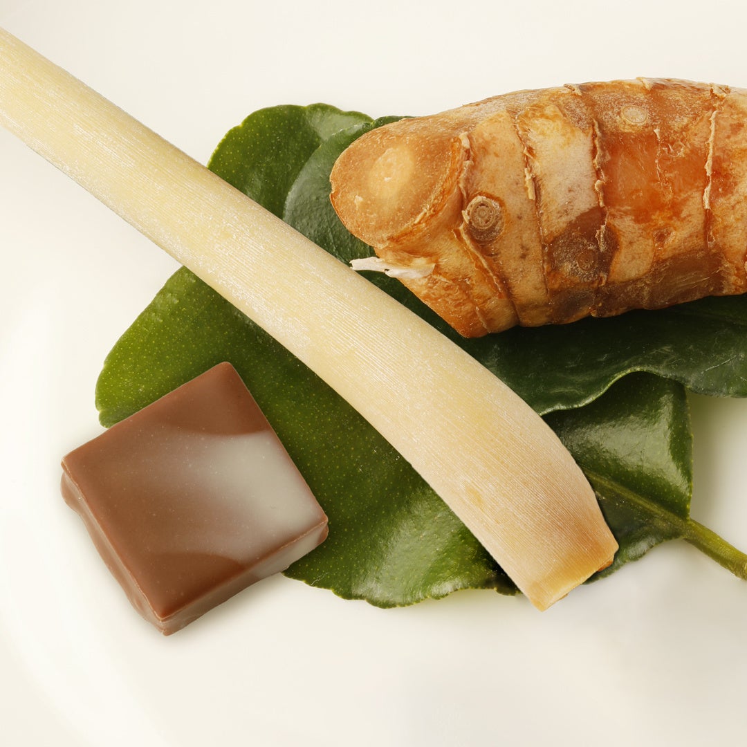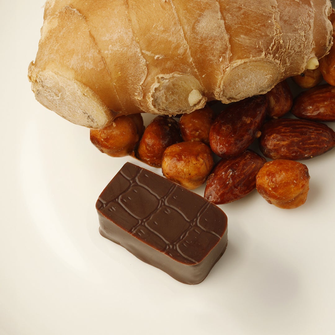 2種のプラリネも、カカオバターに抹茶や生姜をアンフュゼすることによって、素材の香りと味わいを最大限に引き出しました。