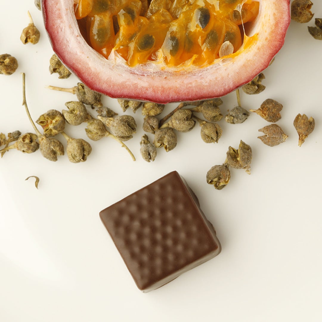 サントスシェフは、通常のガナッシュを作る工程に加え、生クリームやピューレ、カカオバターなど2つの素材にアンフュゼをするこの製法を「ドゥーブル・アンフュジョン」と名付けました。口の中で香りが広がる温度は生クリームやピューレ、カカオバターで異なるため、時間差で溶ける両方の味わいが長く続きます。これにより、アンフュゼしたそれぞれの素材がもつナチュラルな風味や、最初のインパクトがより深く味わえるようになりました。「シソ・フランボワーズ」「ドゥーブル・パッション」「トム ヤム クン」「柚子・バジル」の4粒はこの方法を採用し、驚くほど広がりのある味わいのショコラが完成しました。