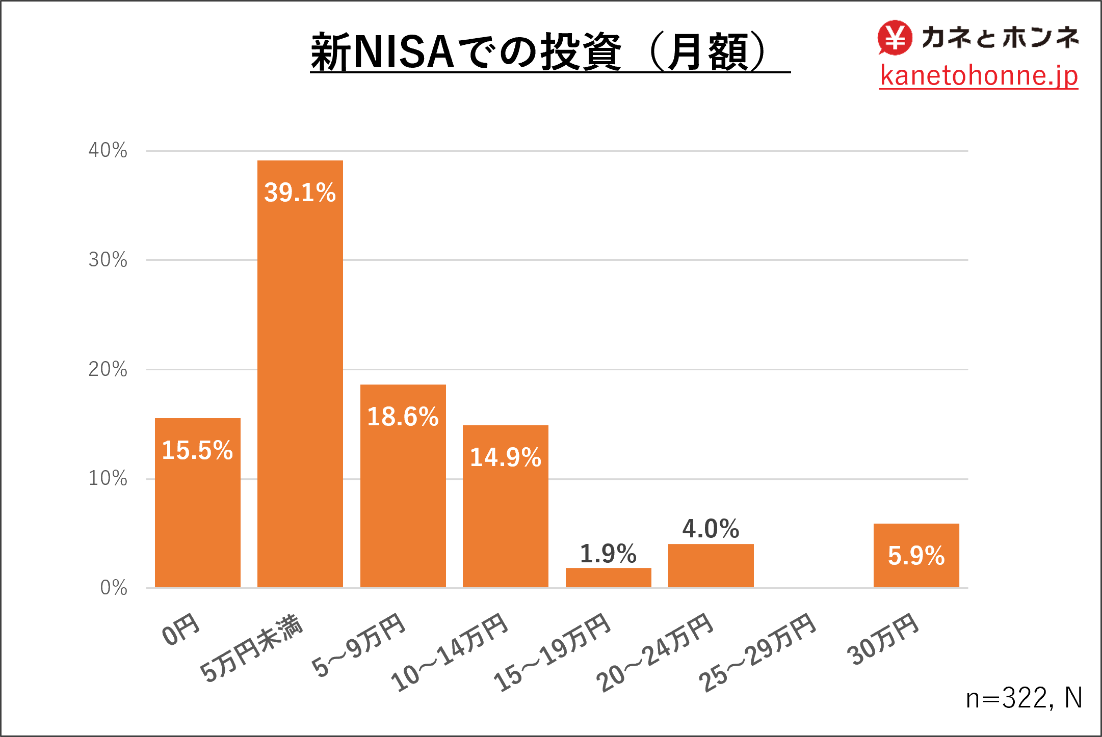 実際の投資額はどのくらいになるのでしょうか。新NISAに関心があると回答した人に、もし新NISAを始めるとすれば月額いくら投資するか聞いたところ、平均は6.1万円、中央値は3万円でした。最大30万円まで投資できますが(正確には年間360万円)、無理のない範囲で投資を考えているようです。
