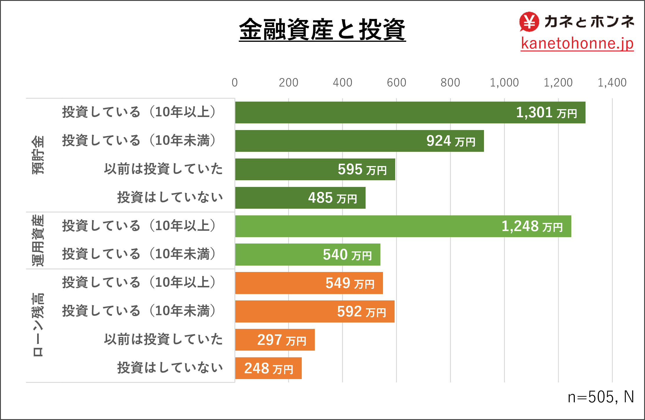 保有している金融資産やローンについて聞いたところ、10年以上の投資をしている人は、預貯金が平均で1,301万円、運用資産が1,248万円、ローン残高が549万円でした。差し引きすると、ちょうど2,000万円の金融資産を保有している計算となります。老後2,000万円問題が話題となりましたが、10年以上投資している人にとっては無用の心配かもしれません。