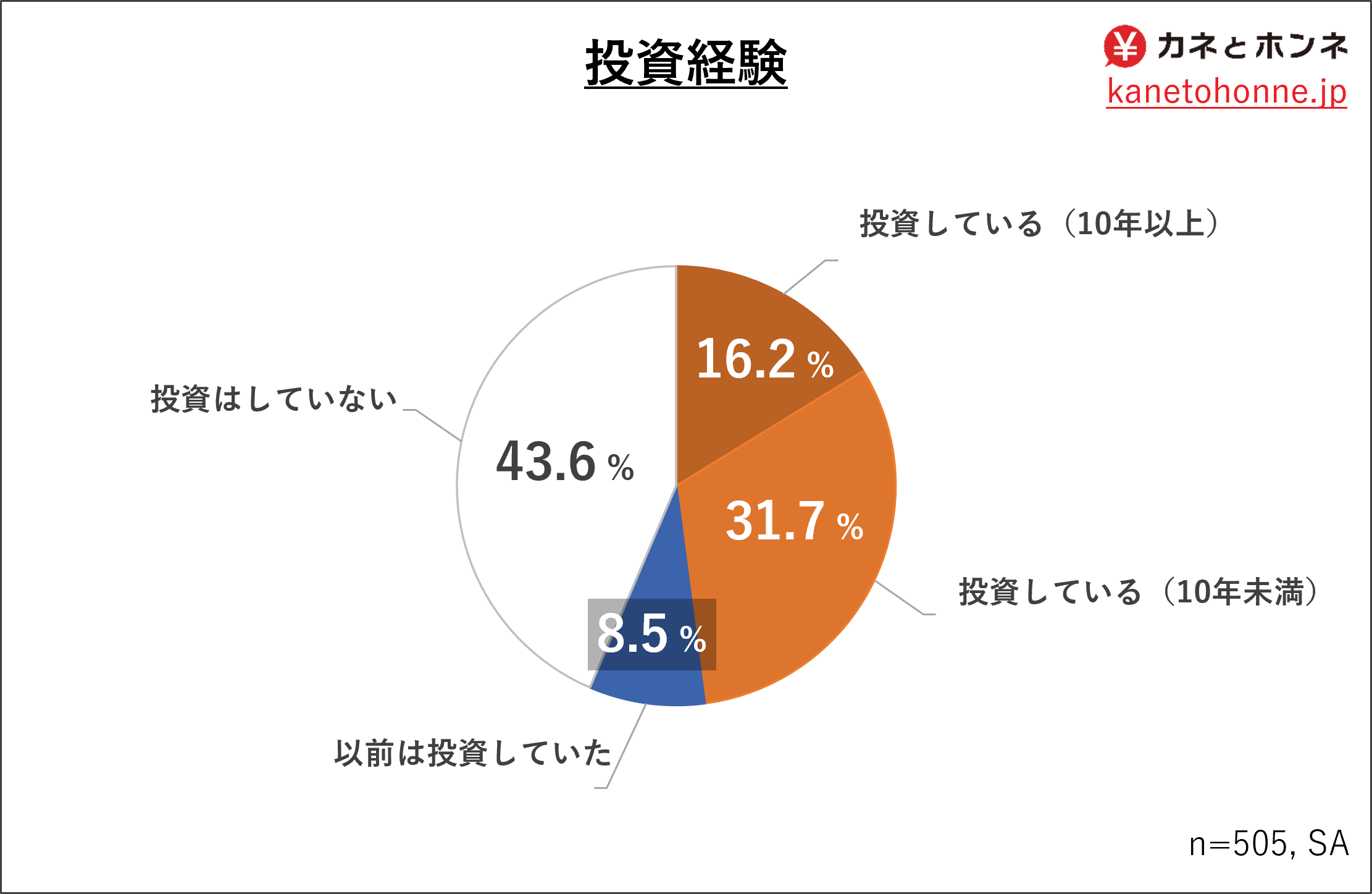 20代から50代のサラリーマンに、株式等の投資経験を聞いたところ、47.9%が「投資している」と回答しました。10年以上の投資をしている人は16.2%、10年未満は31.7%でした。10年前にNISA(少額投資非課税制度)が開始されて以降、投資人口が大きく拡大しているようです。