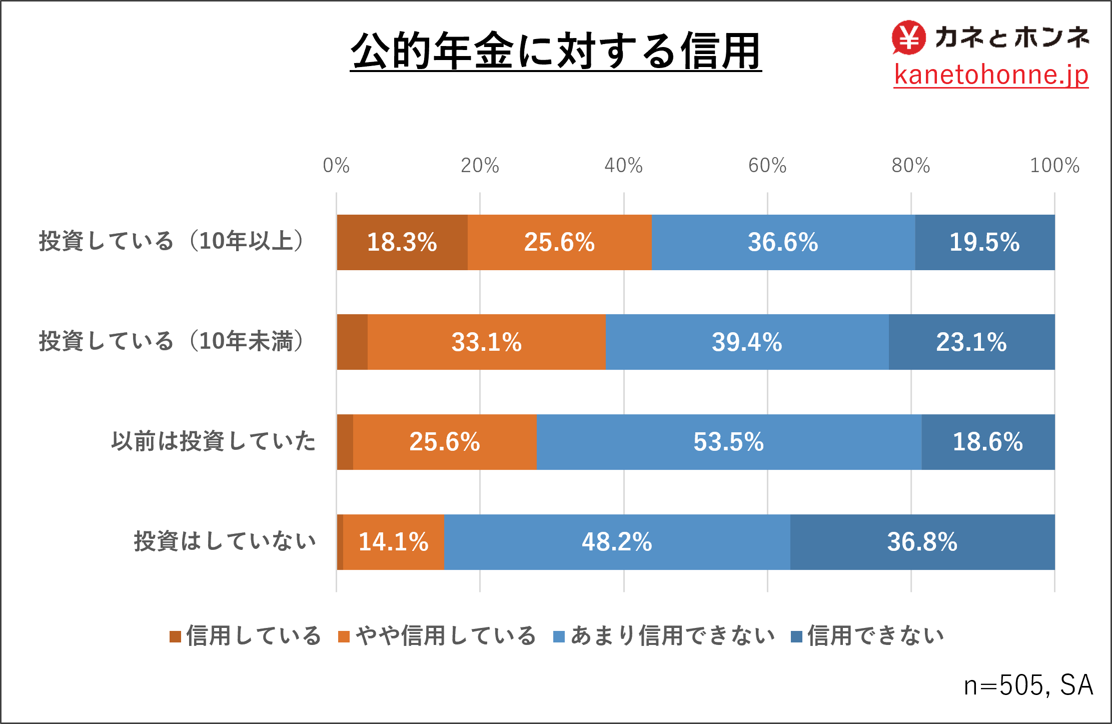 厚生年金等の公的年金を信用しているかどうか聞いたところ、投資をしている人よりも、投資をしていない人の方が、公的年金を信用していないことが分かりました。もっとも信用度が低いのは、「投資はしていない」層で、85.0%が「信用できない」「あまり信用できない」と回答しています。