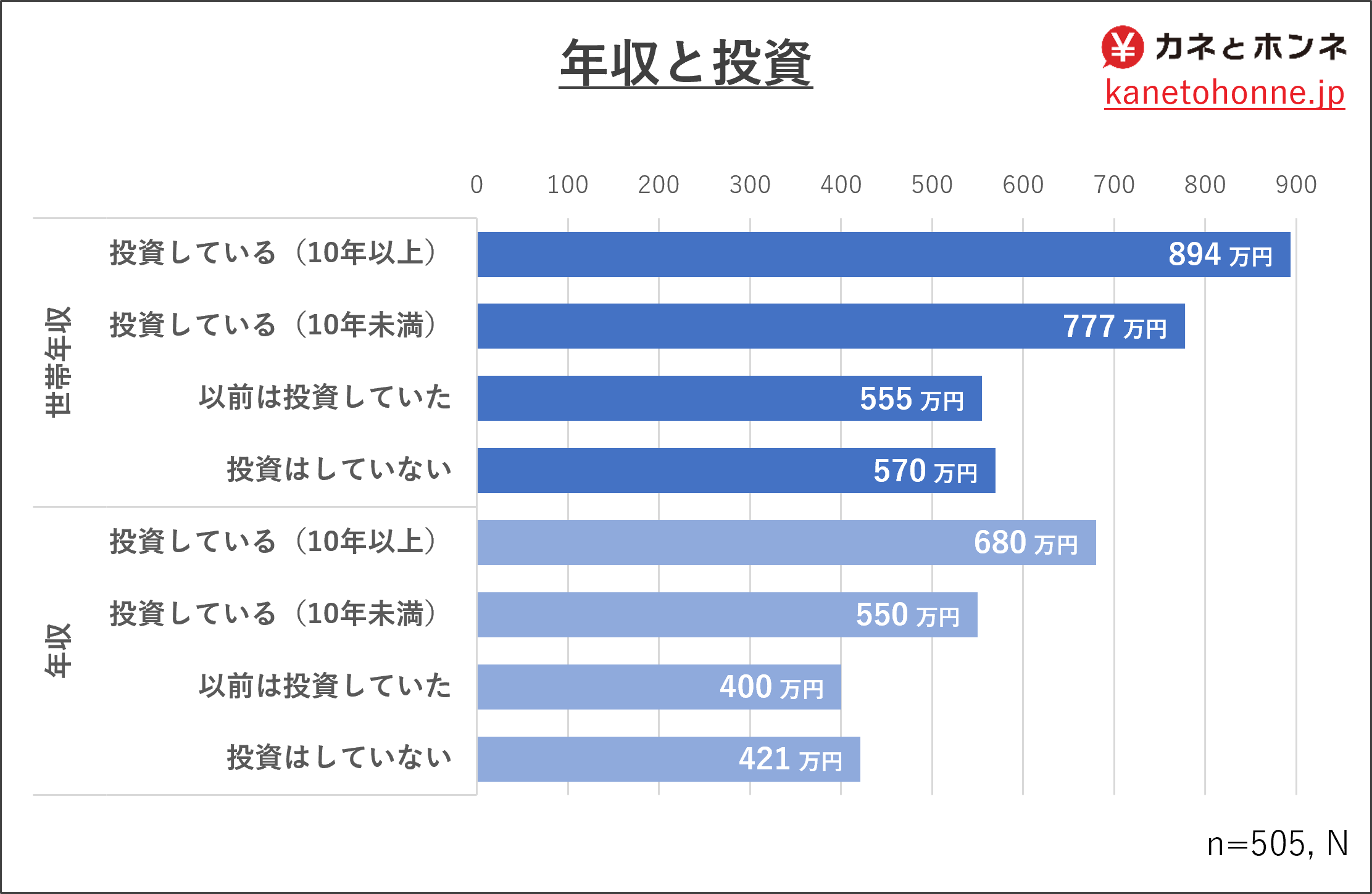 続いて、世帯年収、年収を聞いたところ、世帯年収は投資経験によって大きく異なることが明らかとなりました。具体的には、「投資している(10年以上)」層と、「投資はしていない」層を比較すると、世帯年収で324万円、年収で259万円の差となります。身も蓋もないのですが、投資をするには先立つものが必要で、年収に余裕がないとそもそも投資もできないようです。