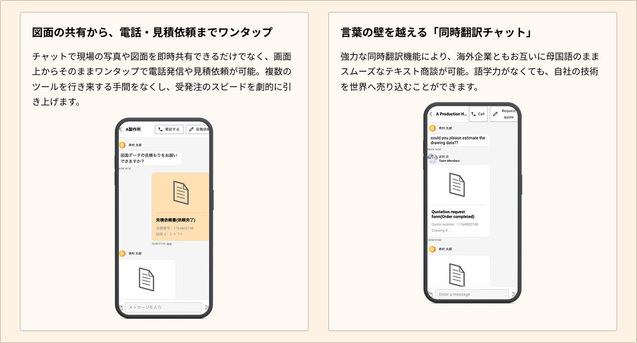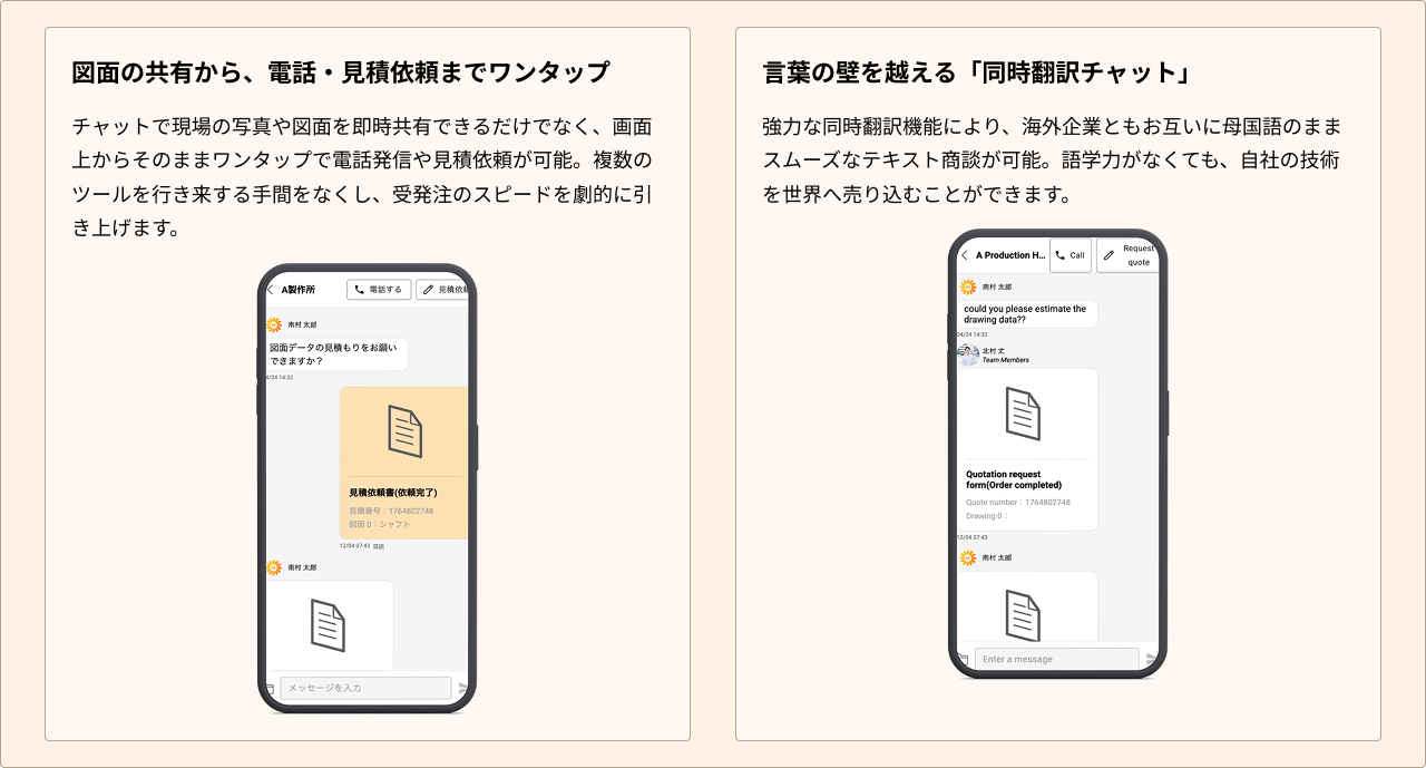 図面の共有から見積依頼、電話発信までスマホ画面からワンタップで完結。さらに、強力な同時翻訳チャット機能により、海外企業ともお互いに母国語のままスムーズなテキスト商談が可能です。語学力がなくても、自社の技術を世界へ直接売り込むことができます。