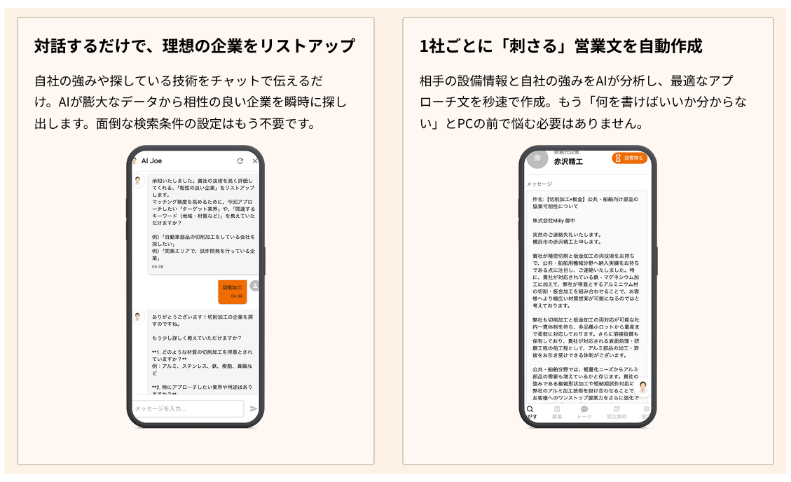 そこで誕生したのが、私に代わって1社1社の要件を丁寧に聞き、最適なパートナーを探し出し、刺さる文章を作ってアプローチしてくれる新機能『AIジョー(AI営業部長)』です。彼がこの「攻め」のマッチングを担うことで、1社でも多くの企業様に協業していただき、職人の皆様が本来の「ものづくり」に100%専念できる会社を増やしてほしいと切に願っています。