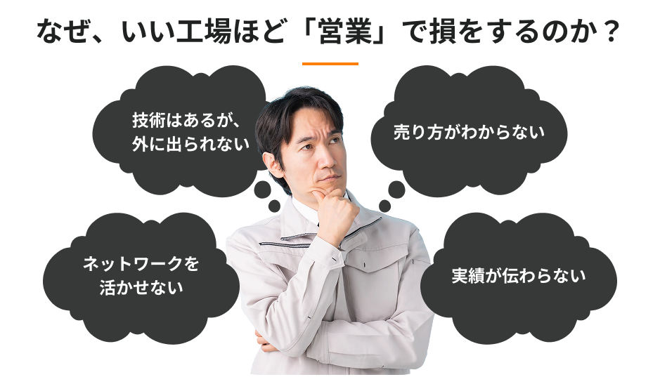 自ら新規開拓をして利益率を改善したくても、現場には「売り方がわからない」「社長自らが現場に入っており、外に出て新しい取引先を見つける時間が取れない」という深刻な課題がありました。毎日工場で誠実に技術を磨き続けている「いい工場」ほど、営業ができずに損をしてしまっているのが現状です。