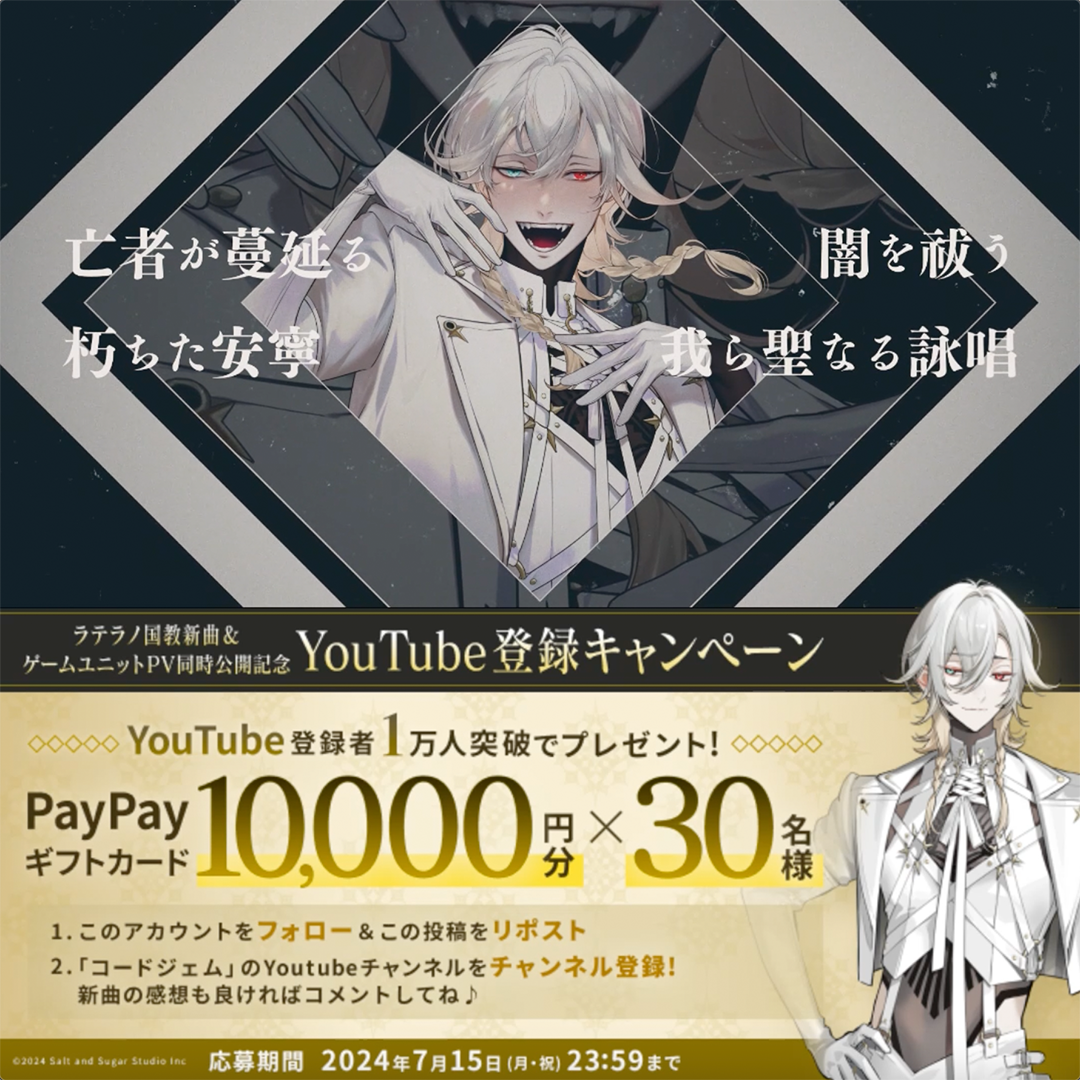 Salt and Sugar Studio(本社:東京都渋谷区、代表取締役:佐野哲也) は、ゲームと音楽のメディアミックスプロジェクト『コードジェム』にて、男性2人組ユニットによる新曲「純白のアリア」とゲームユニットPV第4弾を公開いたしました。また、抽選でPayPayやサイン色紙がもらえる記念キャンペーンを開始いたしました。