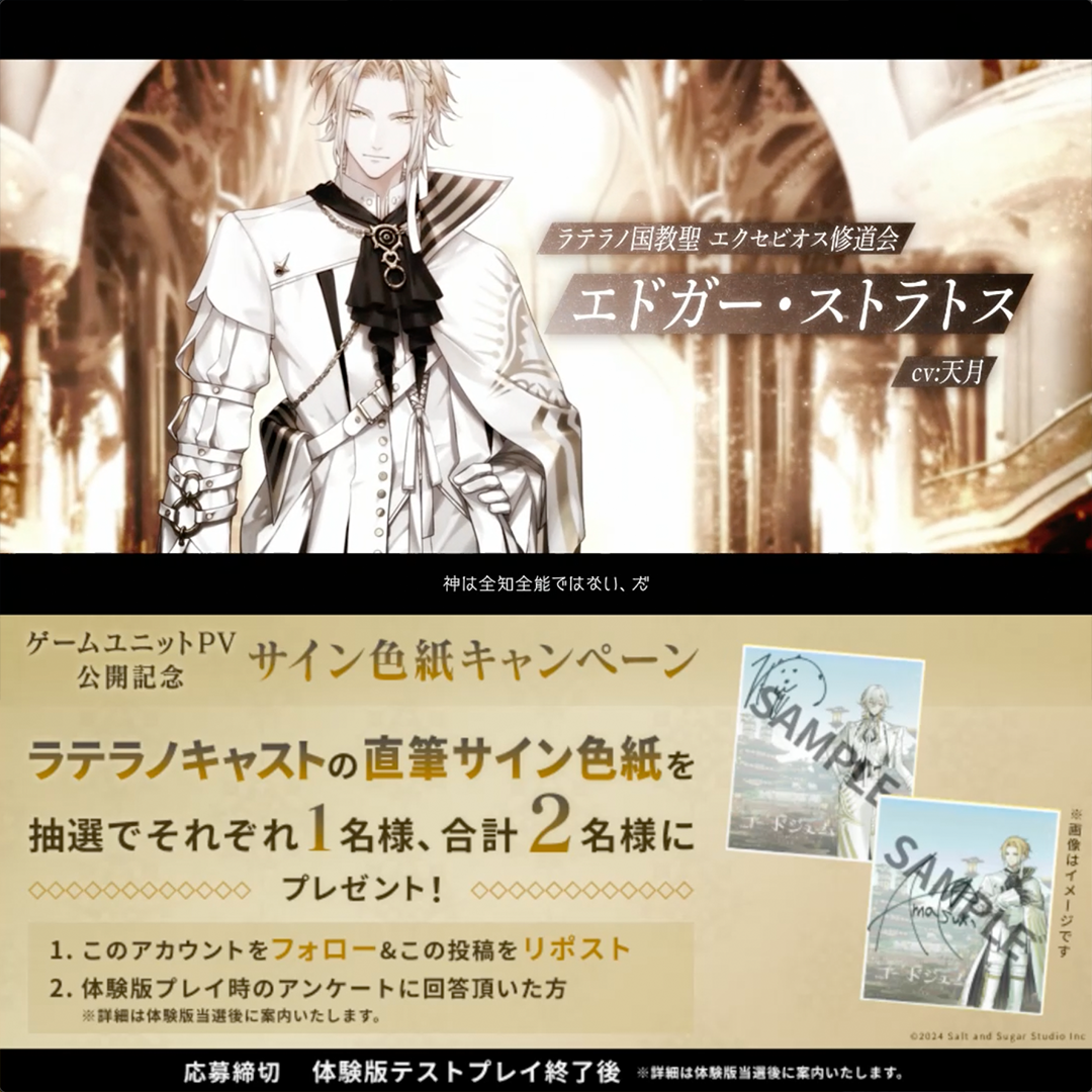 応募期間内に「コードジェム」公式のXアカウントをフォロー・キャンペーン投稿をリポスト、ゲーム体験版プレイ時にアンケート回答した方にラテラノ国教キャスト2名の直筆サイン色紙を抽選で各1名様、合計2名様に当たるキャンペーン。