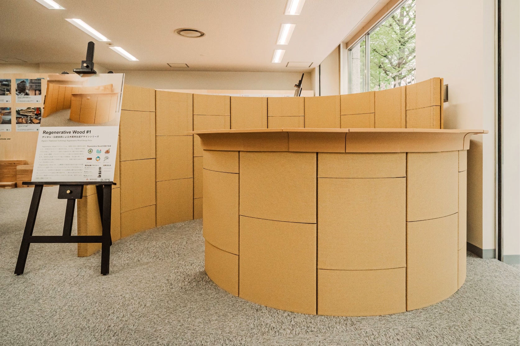 『Regenerative Wood』の考え方と技術を実証するプロトタイプとして、世界初の木質3Dプリント建築物「TSUGINOTE TEA HOUSE」と、このシステムで製作したカウンター・パーテション「Regenerative Wood #1」を展開。「Good Design Marunouchi企画展 TOKYO WOOD TOWN 2040 山と木と東京」(主催:公益財団法人日本デザイン振興会、会期:2024年4月18日~5月12日、東京都千代田区丸の内)に展示し、ご来場の方々よりご好評をいただきました。