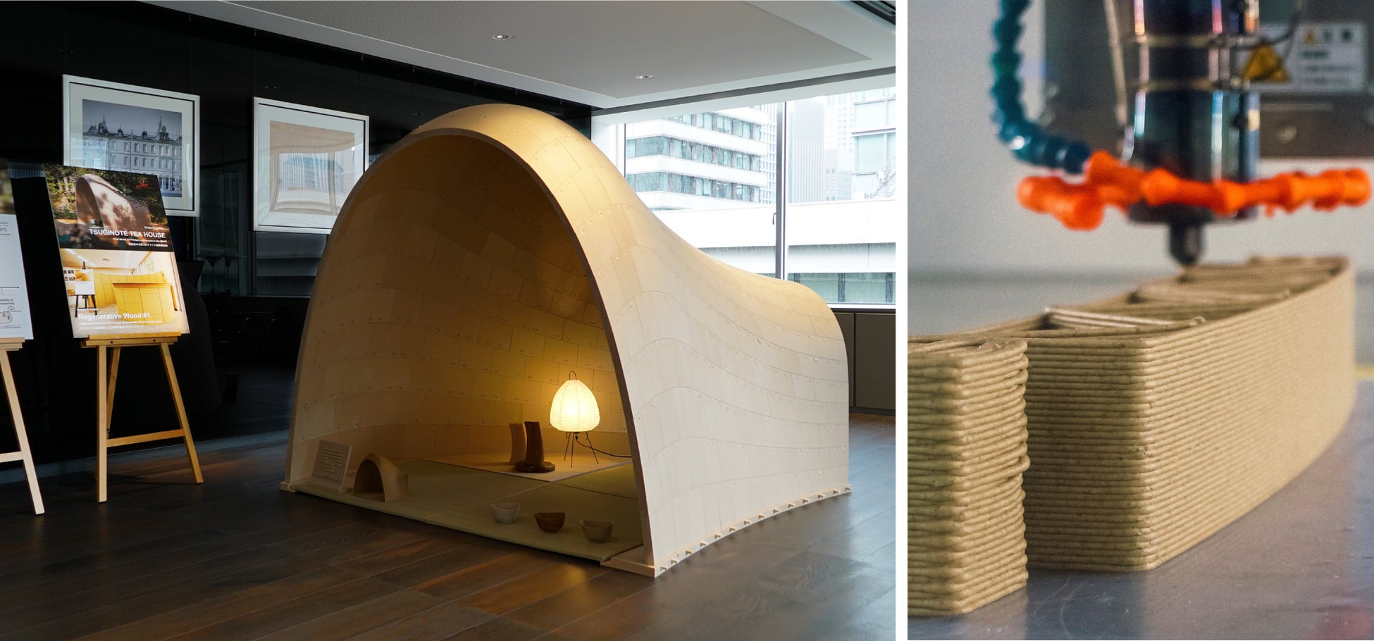 株式会社三菱地所設計(本店所在地:東京都千代⽥区丸の内、代表取締役社⻑:谷澤 淳一)は、当社デザインスタジオおよび木質建築ラボにて、建築や家具のデザインから施工までに至る、木質3Dプリントを用いた生産システム『Regenerative Wood(リジェネラティブ・ウッド)』(以下、本システム)を構築し、そのプロトタイプと位置付けた、世界初※の木質3Dプリント建築物「TSUGINOTE TEA HOUSE」を、当社本店 総合受付に展示しておりますことをお知らせいたします。