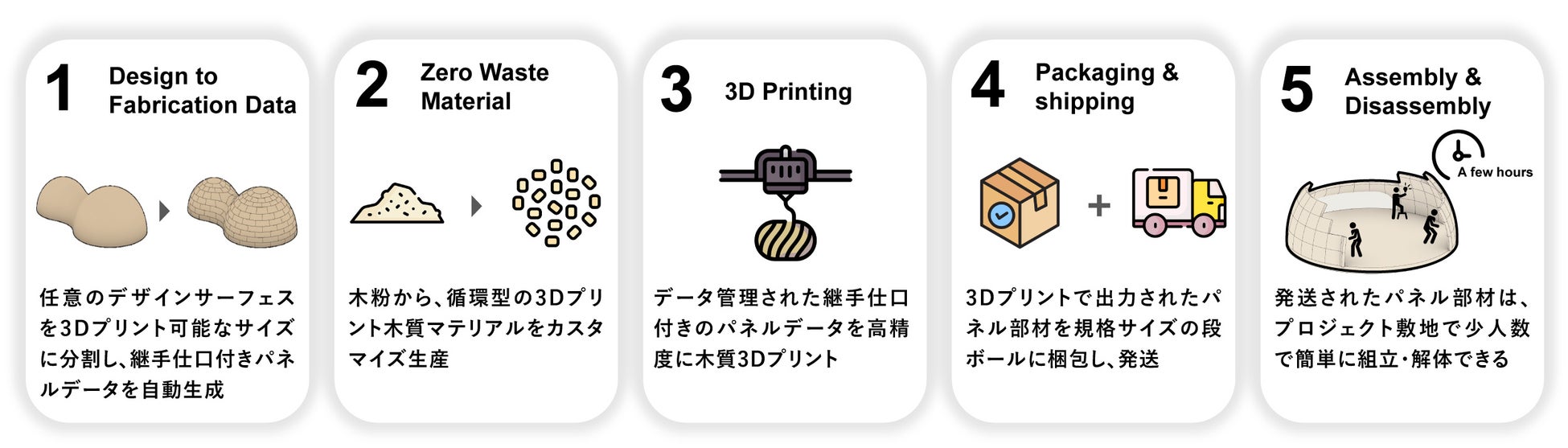 あらゆる木材加工の工程で廃材として生じる木粉を原料に、3Dプリントの安定性を確保した独自の木質3Dプリント材料を製造。プロジェクト現場付近の木を用いて原料を輸送する際に生じるCO2排出を抑制したり、3Dプリント時に出力部材の小材化を図ることで一般の物流に載せ、人の手で組み立てられるようにするなど、生産フロー全体での環境配慮を図っています。