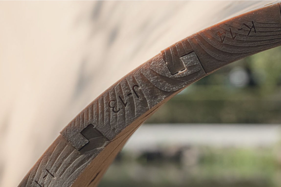 うち、「TSUGINOTE TEA HOUSE」は、ジャパン・ハウス(ブラジル・サンパウロ市)で開催された「『NIHONCHA』展」(2023年12月~24年4月)と、上記「TOKYO WOOD TOWN 2040」を経て、当社本店での展示に至っています。小規模な軽量パーツに分割・輸送し、少人数で組み立てられることから、稼働中の当社総合受付にて、社員4名の手作業で、約2時間程度で施工しました。高さ約1.9m、奥行約1.7mの三次元曲面からなり、高精度の継手仕口により、金物の使用を不要としています。