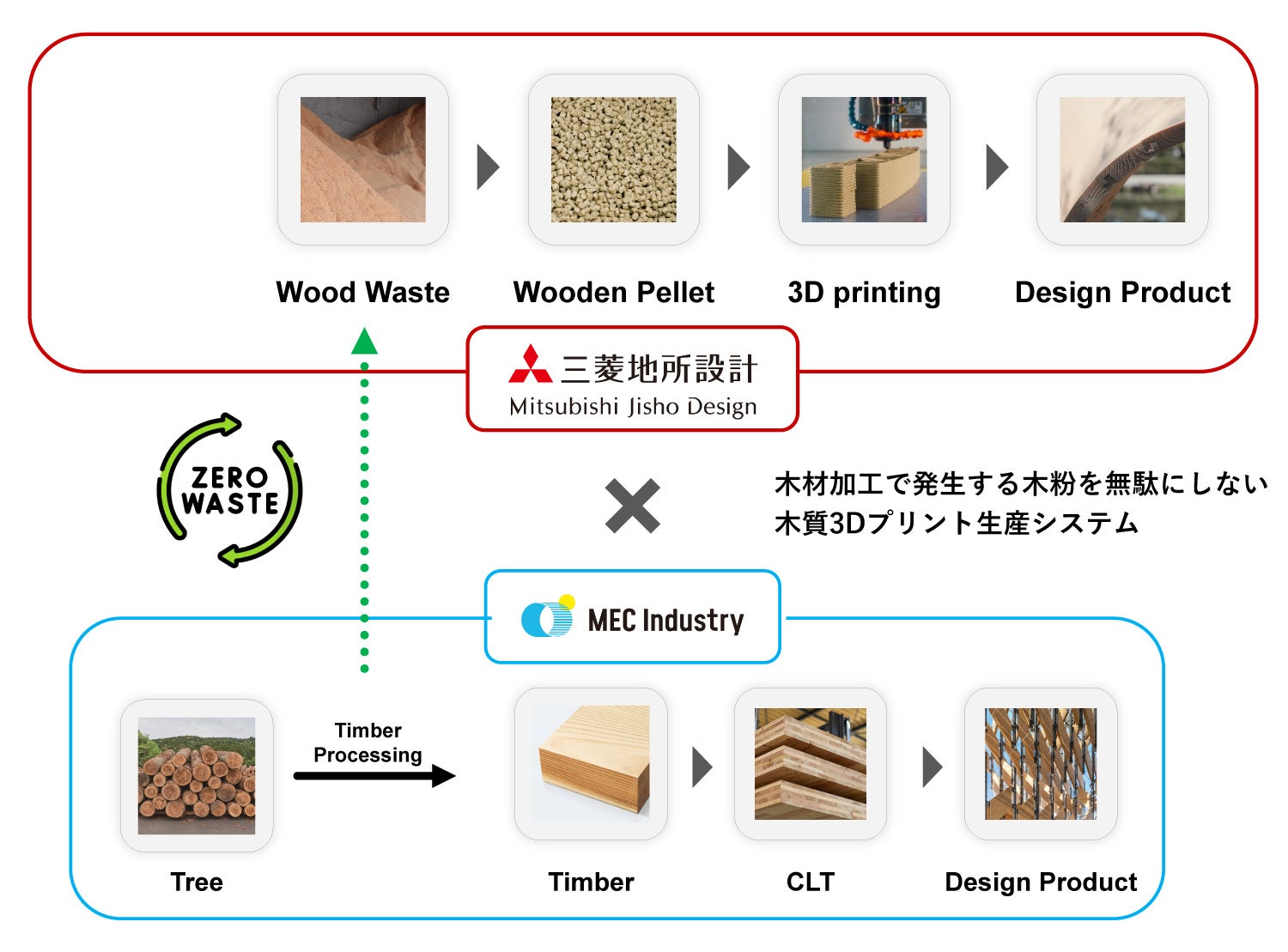 2種のプロトタイプのうち「Regenerative Wood #1」のフィラメントの製造にあたっては、当社が技術協力などを行っている、MEC Industry株式会社(当社と同じく三菱地所グループに所属)より木粉の提供を受けました。製材等の際に発生してしまう木粉を無駄にしない、ゼロ・ウェイスト(Zero Waste/ゴミをゼロにする目標のもと、廃棄物量を削減していくこと)への試みとなっています。