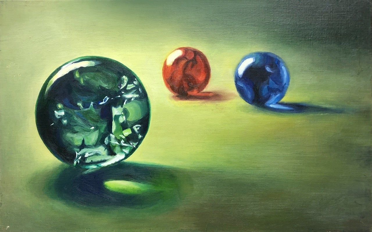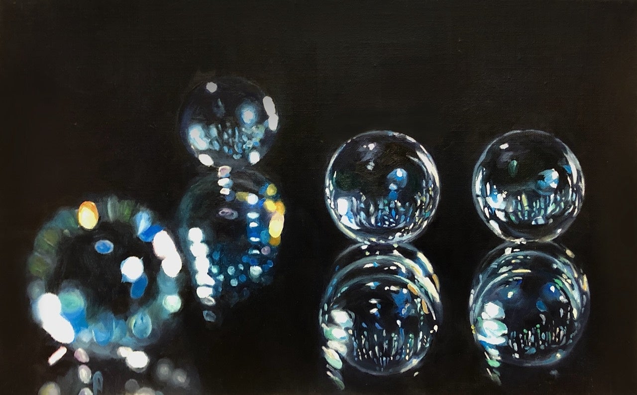 絵はビー玉をモチーフにしています。ビー玉は小さいけれど、光と出会うことで素敵なきらめきを持っていることがわかります。観てくださる方へ、絵を通してご自身やまわりの方が持っている素敵なところに目を向けて、そっと寄りそえる作品になったら嬉しいです。