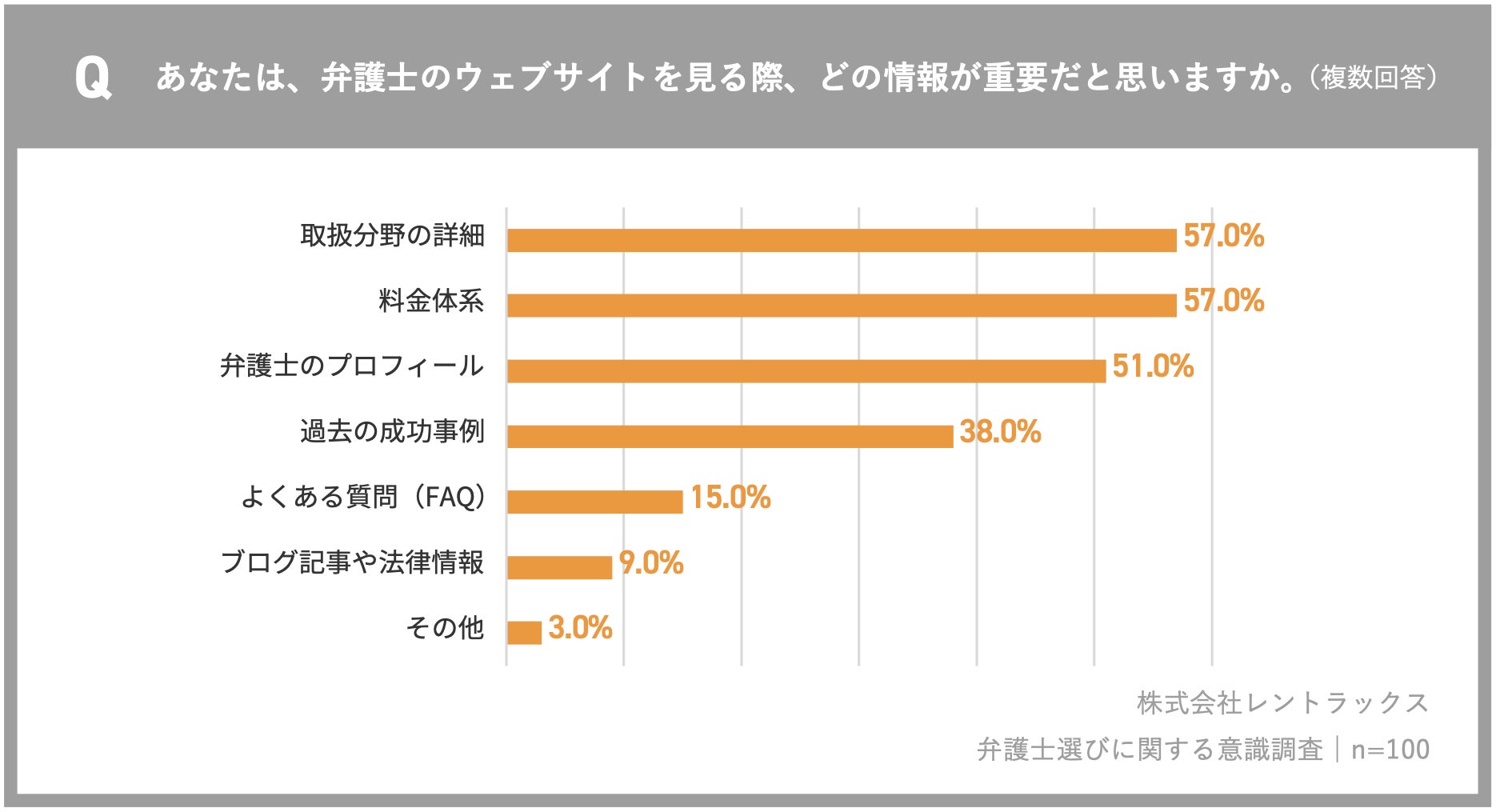 Webサイトには顧客が求める情報を載せることが大切です。当社が実施した調査によれば、弁護士のウェブサイトを見る際に重要視している情報として、「取扱分野の詳細」「料金体系」「弁護士のプロフィール」といった項目が挙げられました。