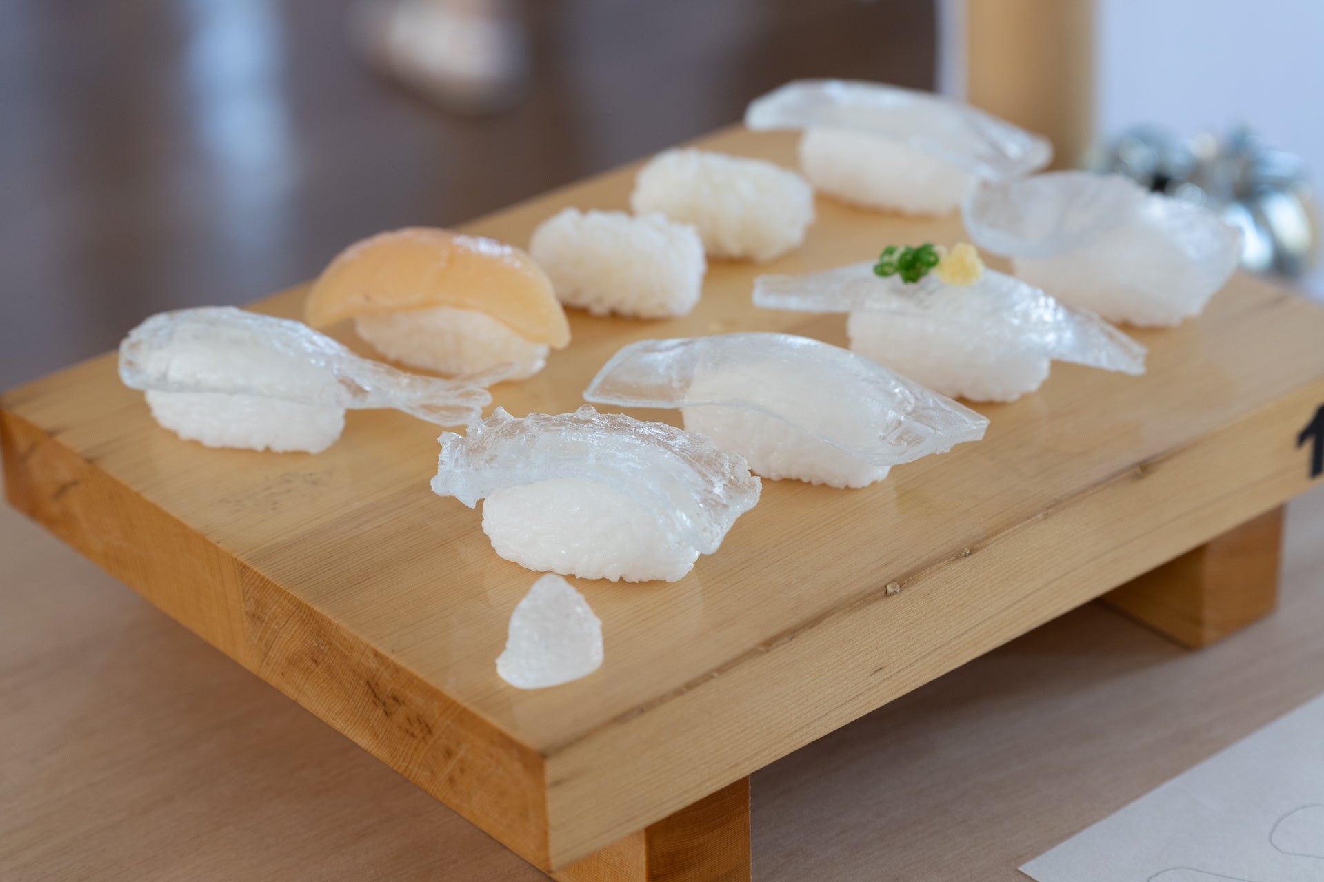 和食の花形、お寿司にも気候変動の影響が迫っています。海水温の上昇や海洋酸性化などにより食べられなくなるネタが増えると予想され、より詳しい調査が求められています。本作品では、無くなる可能性に応じて透明度を変化させた樹脂オブジェの寿司を作成しました。私たちの日常生活に現れるであろう、気候変動の影響を直感的に感じていただける内容です。