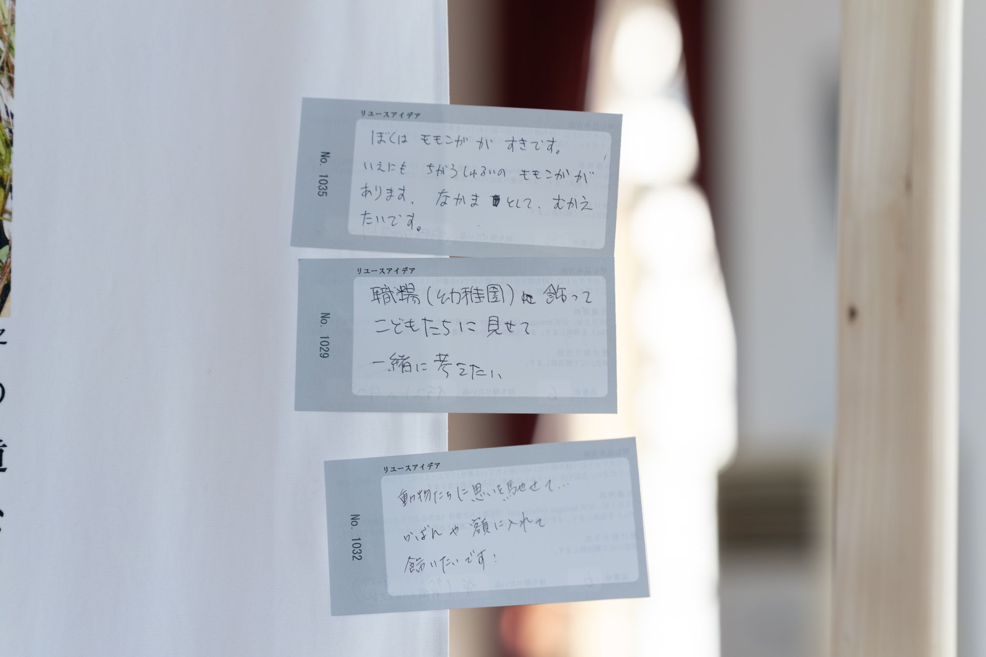 また、持ち帰り希望者にはリユース方法を対象物に付箋で貼り付けて「応募」いただきます。HELP展は時間が経過するごとに、展示作品や会場造作のリユースのアイデアが増えていき、来場者と共創する展示になります。ぜひ、会期中何度もお楽しみください。