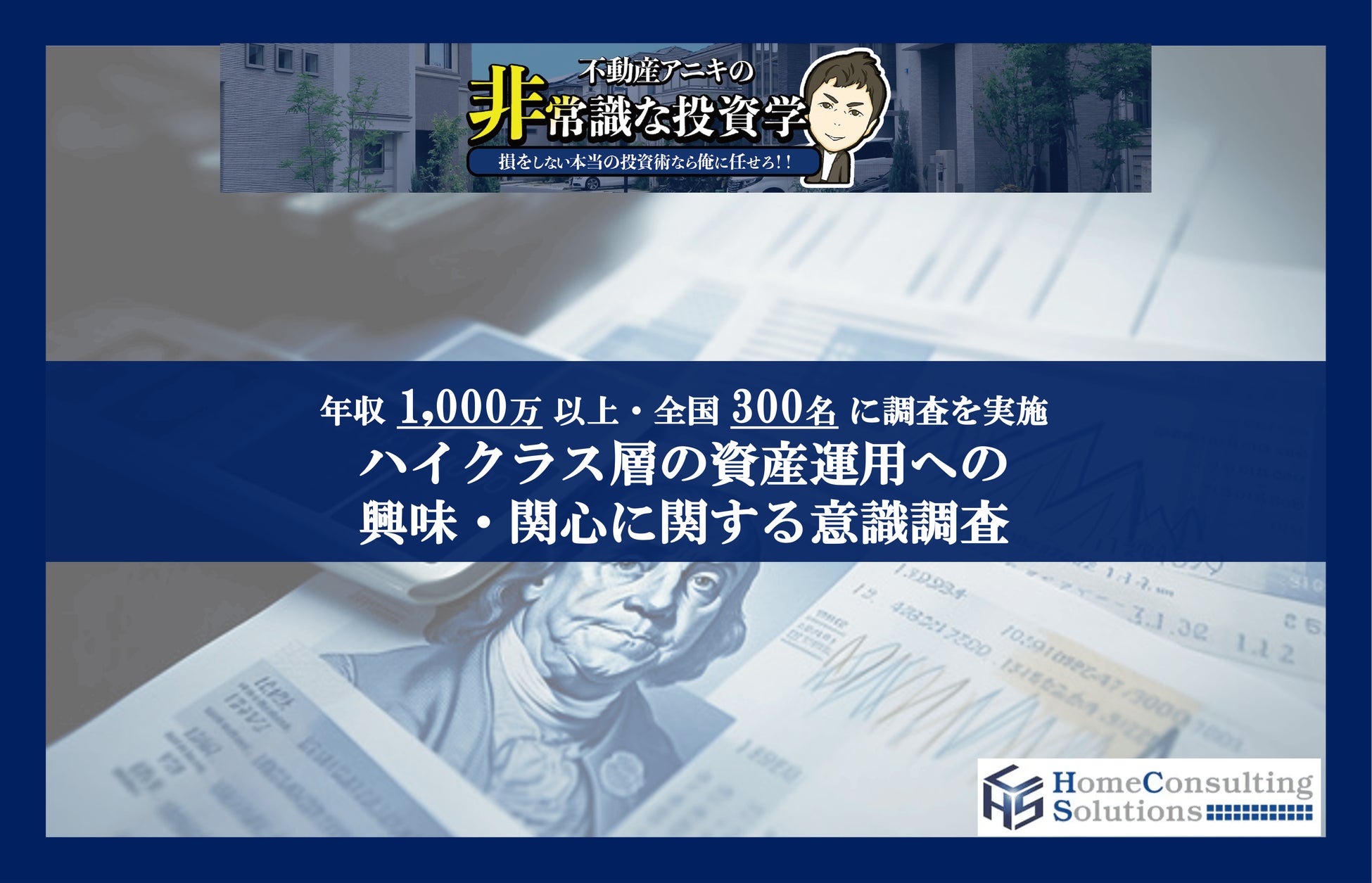 不動産コンサルティングのホームコンサルティングソリューションズ株式会社(愛知県名古屋市、代表・小林大祐)は、年収1,000万円以上の全国男女25〜60歳の300名を対象に、「資産運用への興味・関心」についての意識調査を実施しました。