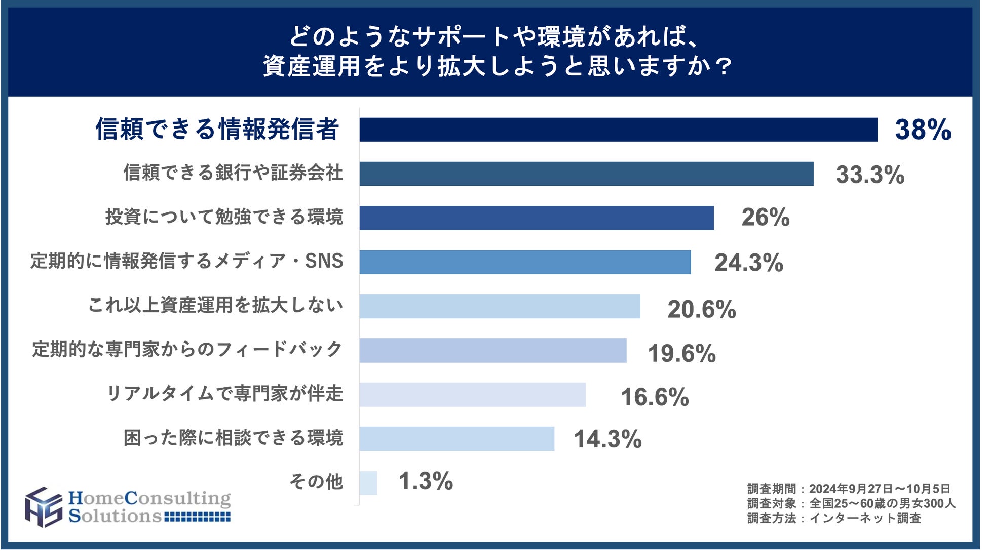 現在行っている投資行動について、どのようなサポートがあれば資産運用をより拡大しようと思うかを聞いたところ、「信頼できる情報発信者(38%)」と回答した方が最も多い結果となり、次いで「信頼できる銀行や証券会社(33.3%)」が多い結果となりました。