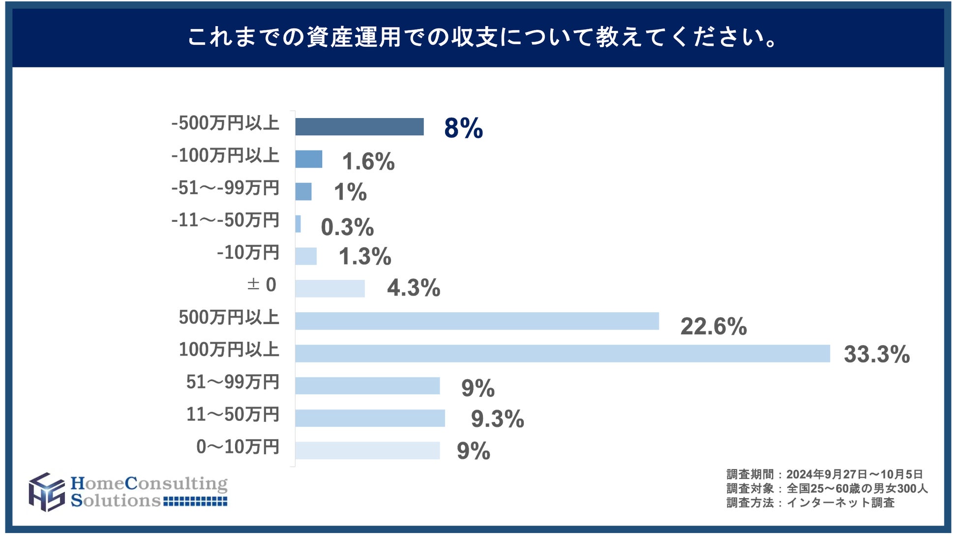 これまでの資産運用での収支について聞いたところ、「100万円以上(33.3%)」と回答した方が最も多い結果となりました。また、「500万円以上(22.6%)」と回答した方も多いものの、一定数「-500万円以上(8%)」と回答した方もいることがわかりました。