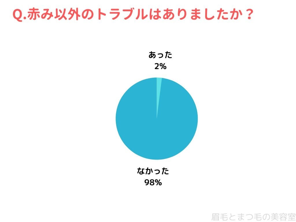 赤み以外のトラブルがあるか質問をさせていただいたところ「なかった(98%)」、「あった(2%)」ということが分かりました。