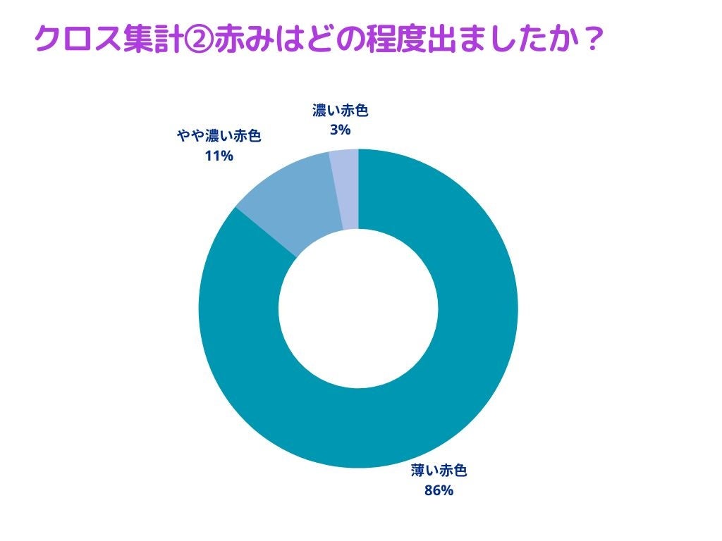どのくらいの赤みが出たかお尋ねしたところ「薄い赤色(86%)」、「やや濃い赤色(11%)」、「濃い赤色(3%)」という結果になりました。