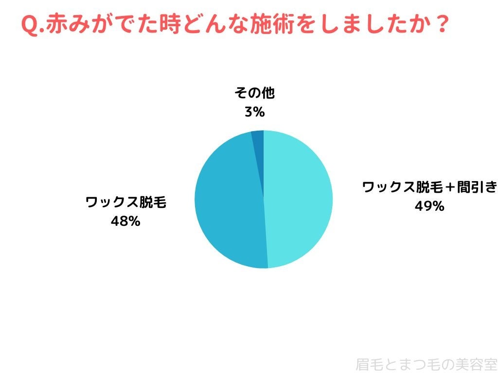 赤みが出たときは「ワックス脱毛+間引き(49%)」の施術をしている人が多い!ワックス脱毛による刺激が赤みの原因か