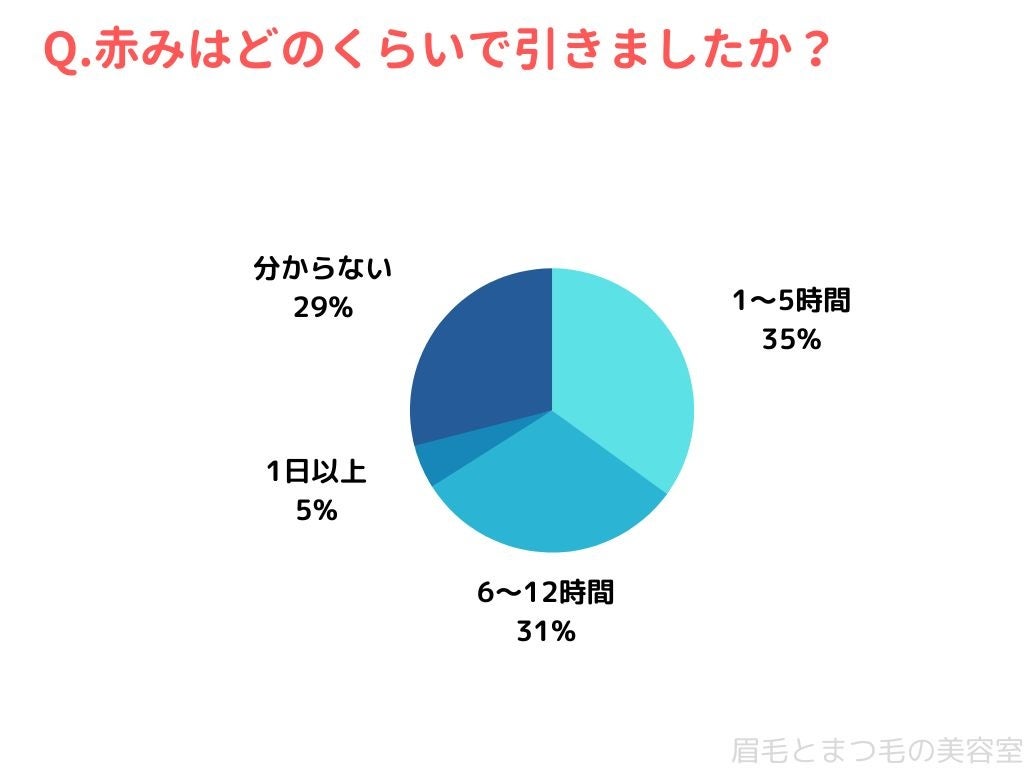 赤みが出た人にお聞きしたところ「1~5時間(35%)」、「6~12時間(31%)」、「1日以上(5%)」という結果になり、「分からない(29%)」という人も多かったです。