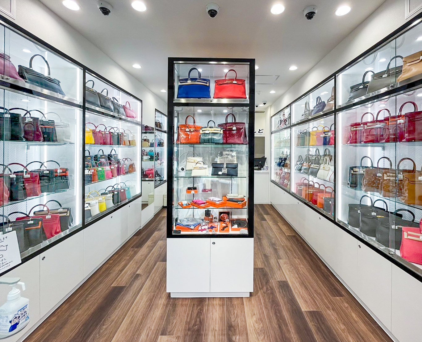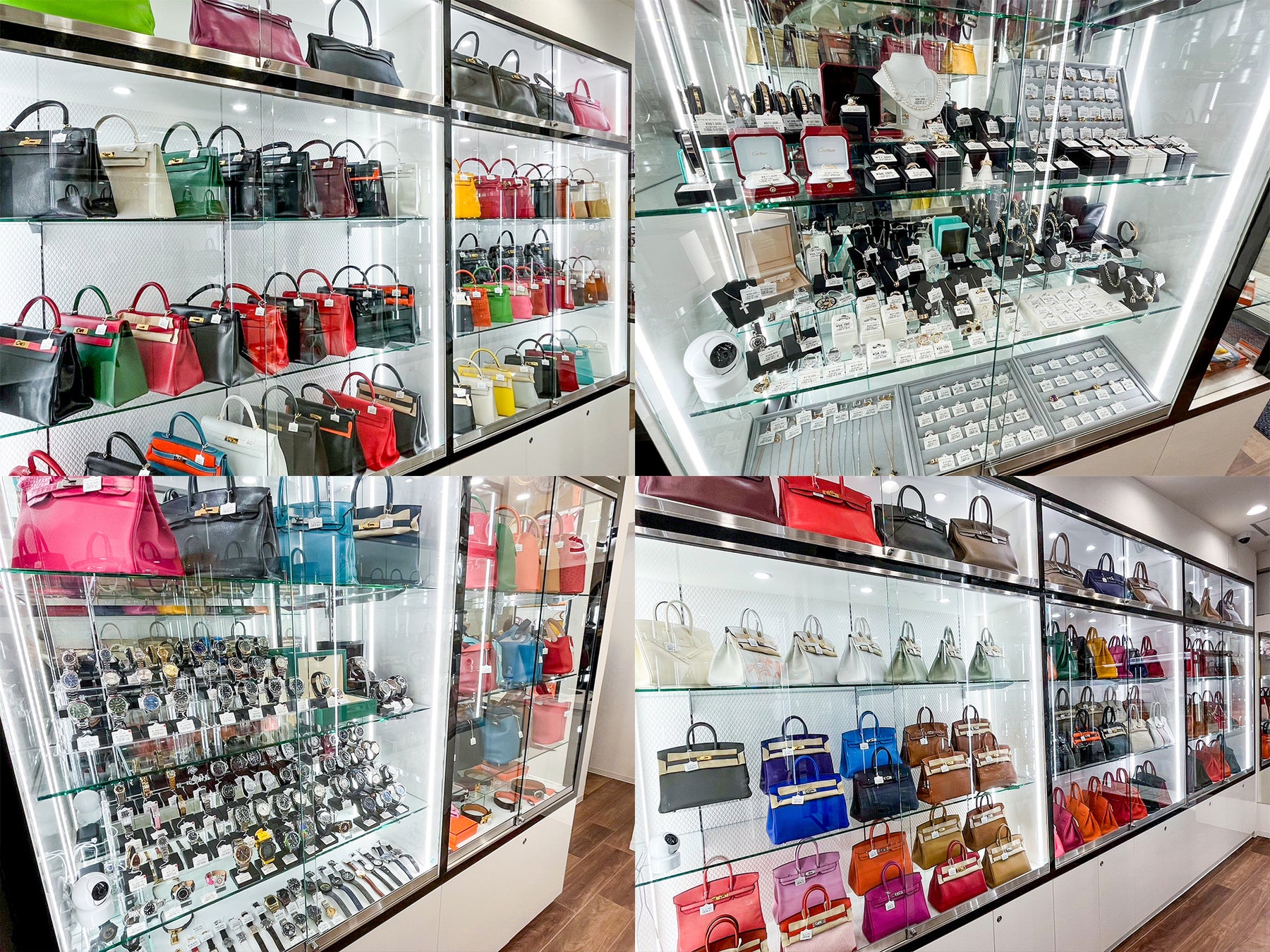 1Fの販売フロアは売り場面積12坪ながら、エルメスのバーキンやケリーを中心に、ロレックスやオメガなどの時計、カルティエやティファニー、ブルガリといったジュエリーを含め約700点を圧縮陳列。
