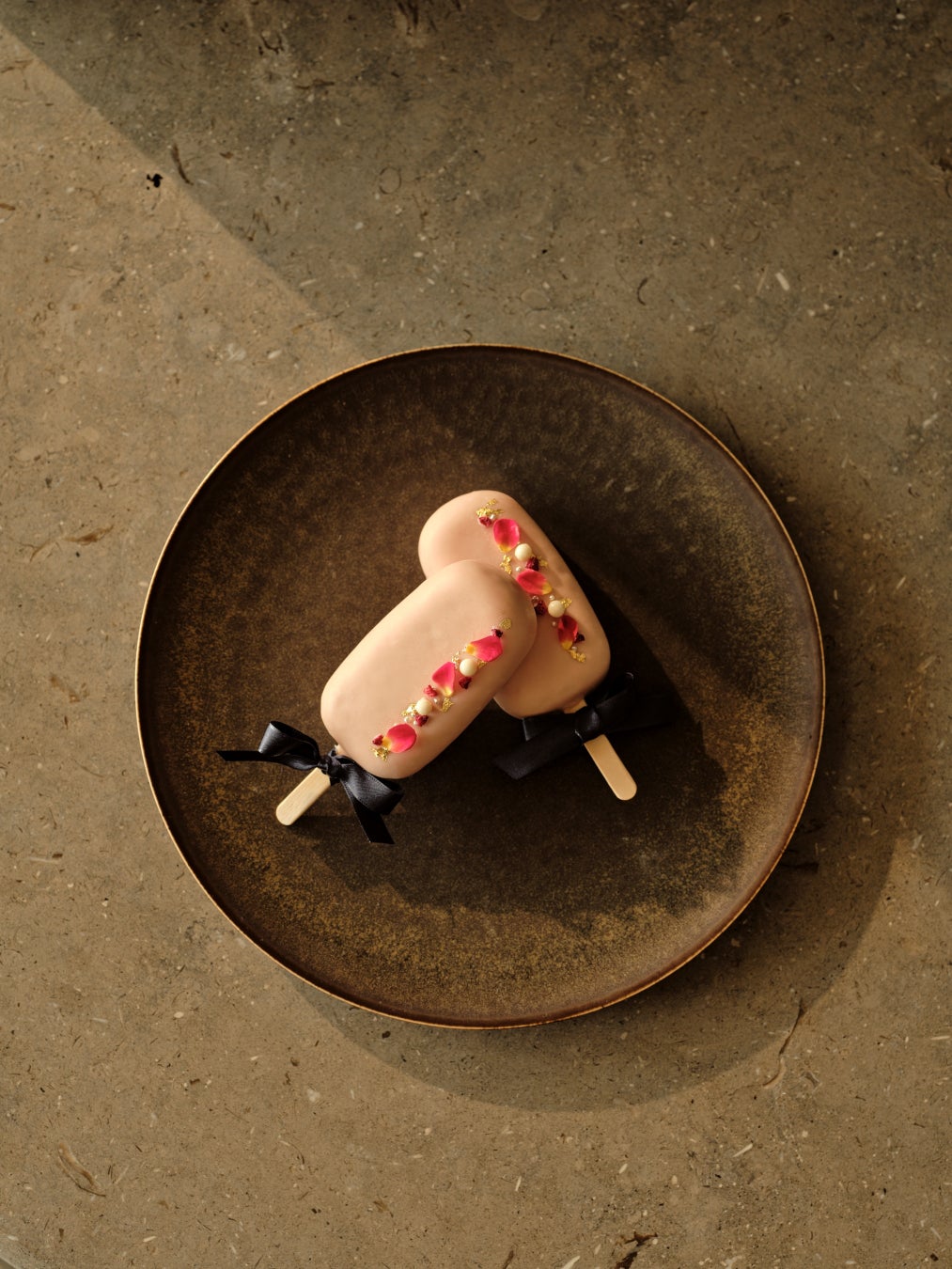アイスキャンディ―をモチーフにした「ジャヌ ポップ」は、アーモンドビスキュイとラズベリーガナッシュを合わせ、自家製シロップで漬け込んだドライフルーツや、パールクラッカン、ナッツを贅沢に使って仕上げました。鮮やかなルビー色が美しい、濃厚なフルーティーさとフレッシュな酸味のルビーチョコレート、ざっくりと刻んだアーモンドでデコレーションしたジャヌ ポップは、お子さまもお楽しみいただける、この時季限定のデザートです。