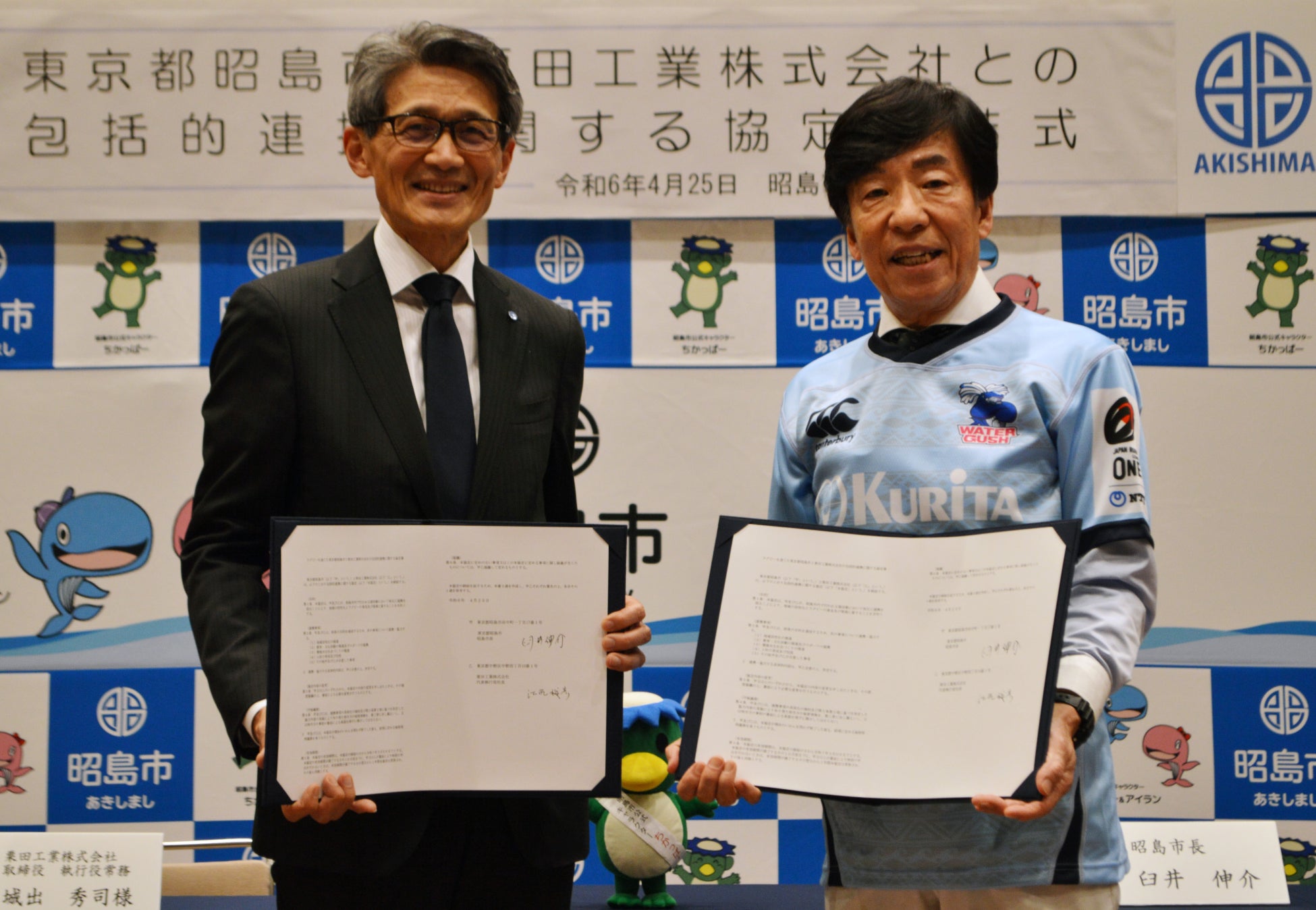 栗田工業株式会社(本社:東京都中野区、社長:江尻 裕彦、以下:当社)は本日、クリタグループのラグビー部であるクリタウォーターガッシュ昭島(以下:当社ラグビー部)のホストエリアである東京都昭島市(市長:臼井伸介)と、当社ラグビー部の活動を通じた包括的な連携に係る協定書(以下:連携協定)を締結しました。