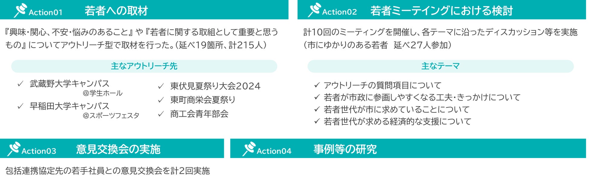 これらの実態を把握するため、市では市政モニター調査(2回)のほか、大学キャンパスや地域イベントなどに出向くアウトリーチ型のヒアリング調査を実施しています。