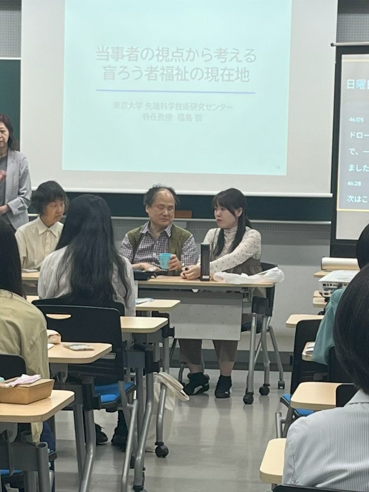 内容:教職課程の授業内にて、先天性盲ろう者で当会理事の森敦史が講義。自身の教育歴や現在の勤務内容、また支援体制の現状について学生に語り、コミュニケーションや関わり方の工夫について伝えました。