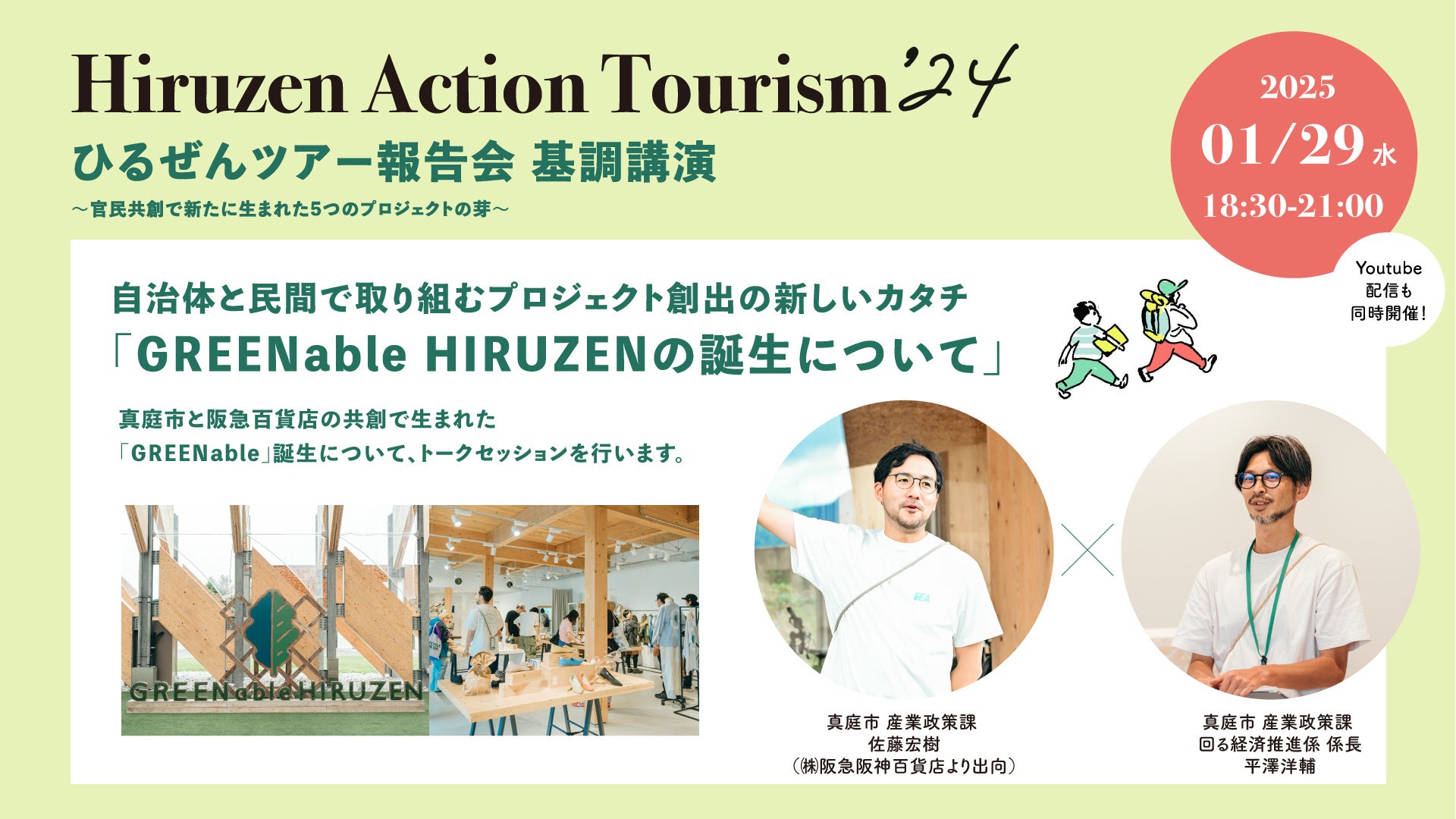 また当日は、基調講演として、真庭市と阪急阪神百貨店の共創で生まれた観光文化発信拠点施設「GREENable HIRUZEN」誕生についてトークセッションを行います。
